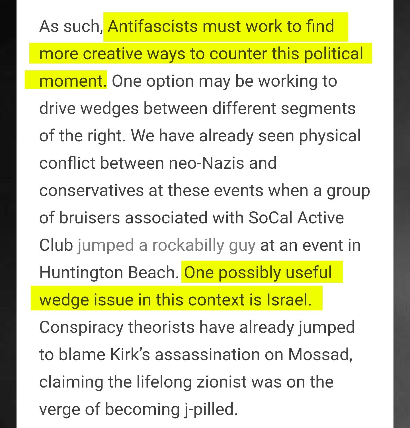 To counter a cultural shift away from their dehumanization tactics — now deeply mainstreamed on the left — Antifa recommend dividing the right against itself. Specifically, they point to Israel as the wedge issue, noting waning support for the war and growing criticism of Benjamin Netanyahu among prominent conservative figures and popular conspiracy theorists.