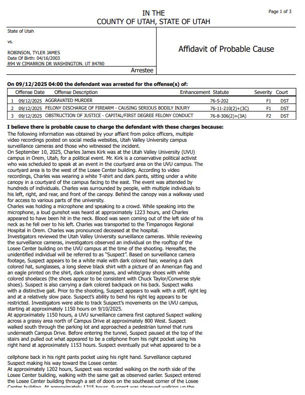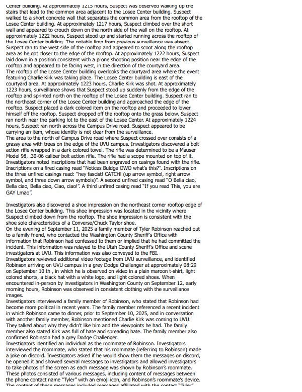 A family member who helped identify Robinson to investigators said he said that Charlie Kirk was coming to Utah Valley University and is “full of hate and spreading hate.” Robinson’s father turned him in, and the family has been highly cooperative in the investigation.