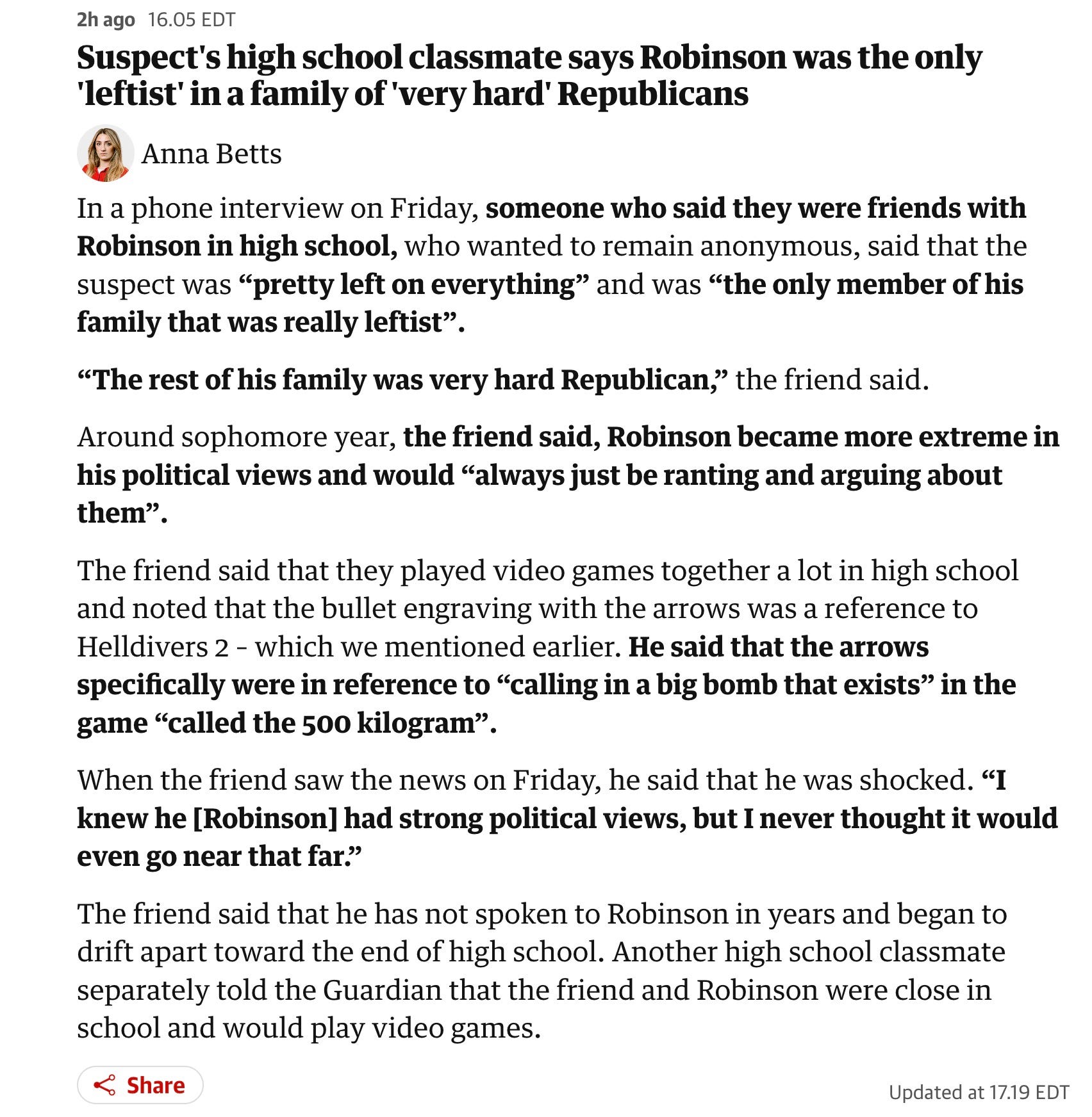 Later in the day, Guardian reporter Anna Betts reported out an interview with Robinson’s former close friend from high school. The story, which has not been widely shared, reveals that Robinson was radicalizing to the left as early as his sophomore year of high school.