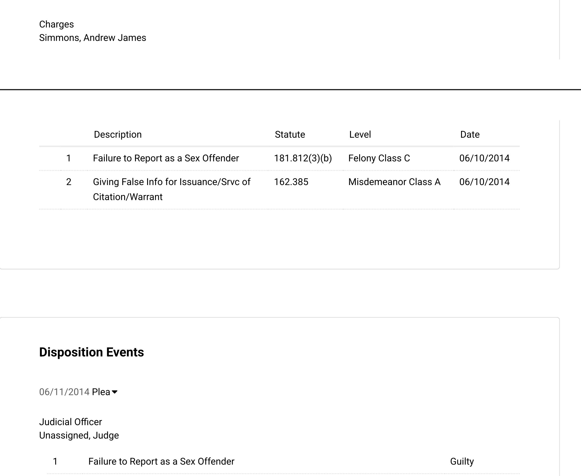 Simmons was convicted in 2014 in Washington County, Ore. for failing to report as a sex offender. A charge of giving false information was dismissed in the plea deal. He was sentenced to two years probation, which he violated in May 2016, resulting in a 20-day county jail sentence.