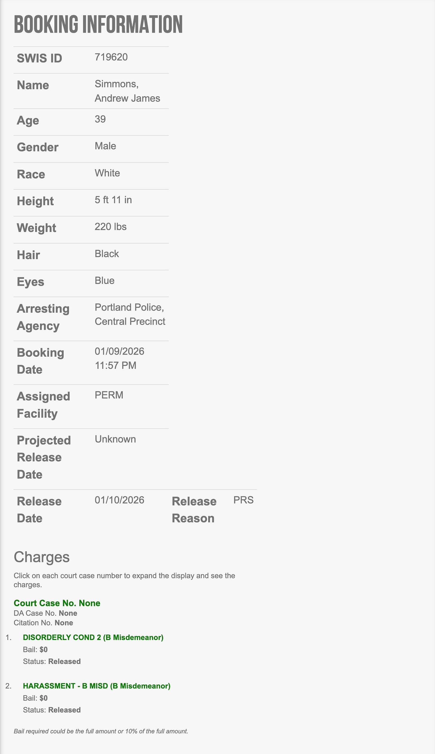 Per Oregon law, Simmons was quickly released without bail.