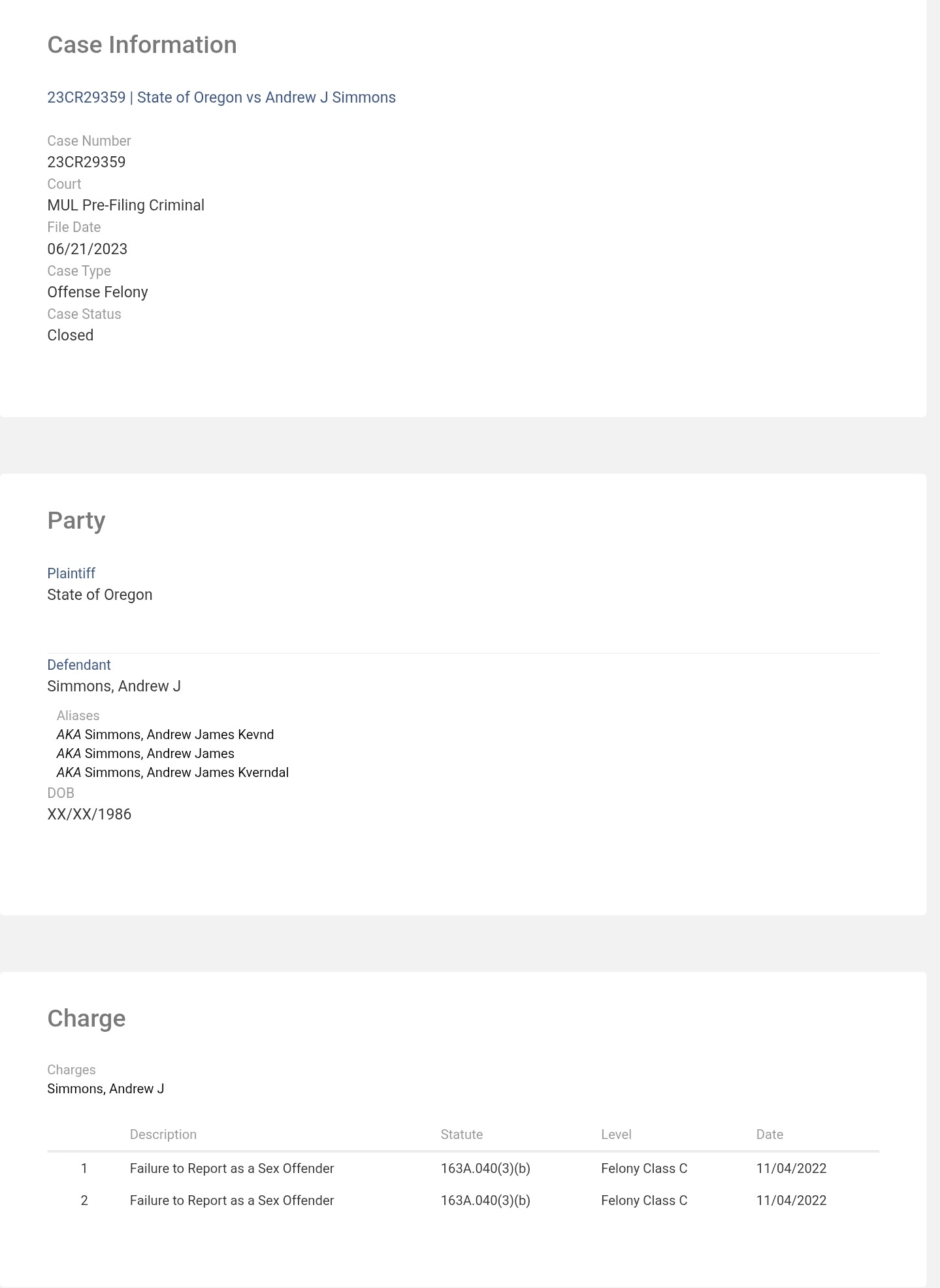 Oregon has different tiers of sex offender registration, and only the most severe tier is available for public view. Simmons’ case is not publicly accessible in Oregon, or his sex crime conviction may be from another state.