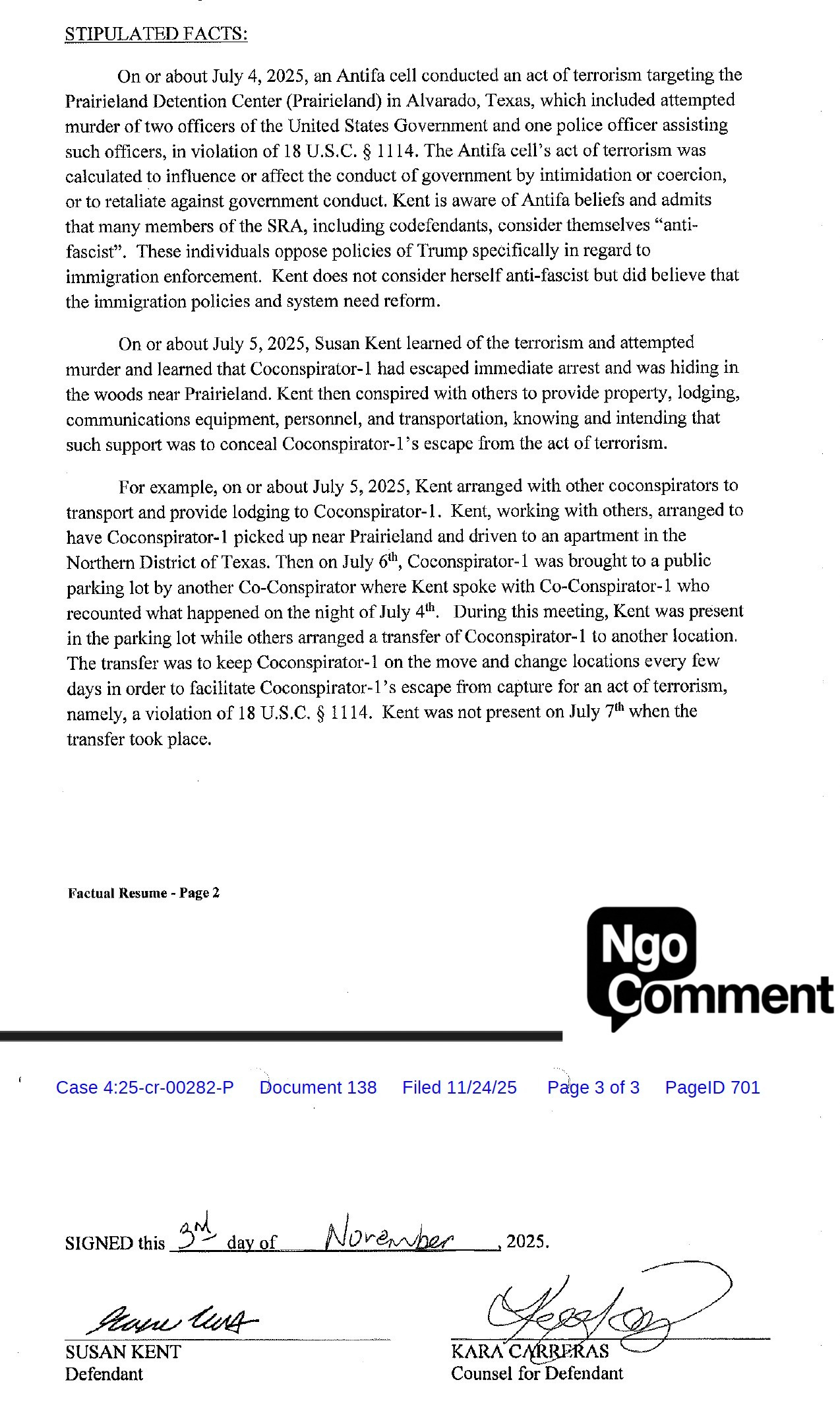 “On or about July 4, 2025, an Antifa cell conducted an act of terrorism targeting the Prairieland Detention Center in Alvarado, Texas, which included attempted murder of two officers of the United States Government and one police officer assisting,” both Morgan and Kent admitted to in signed stipulated facts as part of their plea deals. “The Antifa cell’s act of terrorism was calculated to influence or affect the conduct of government by intimidation or coercion, or to retaliate against government conduct.”