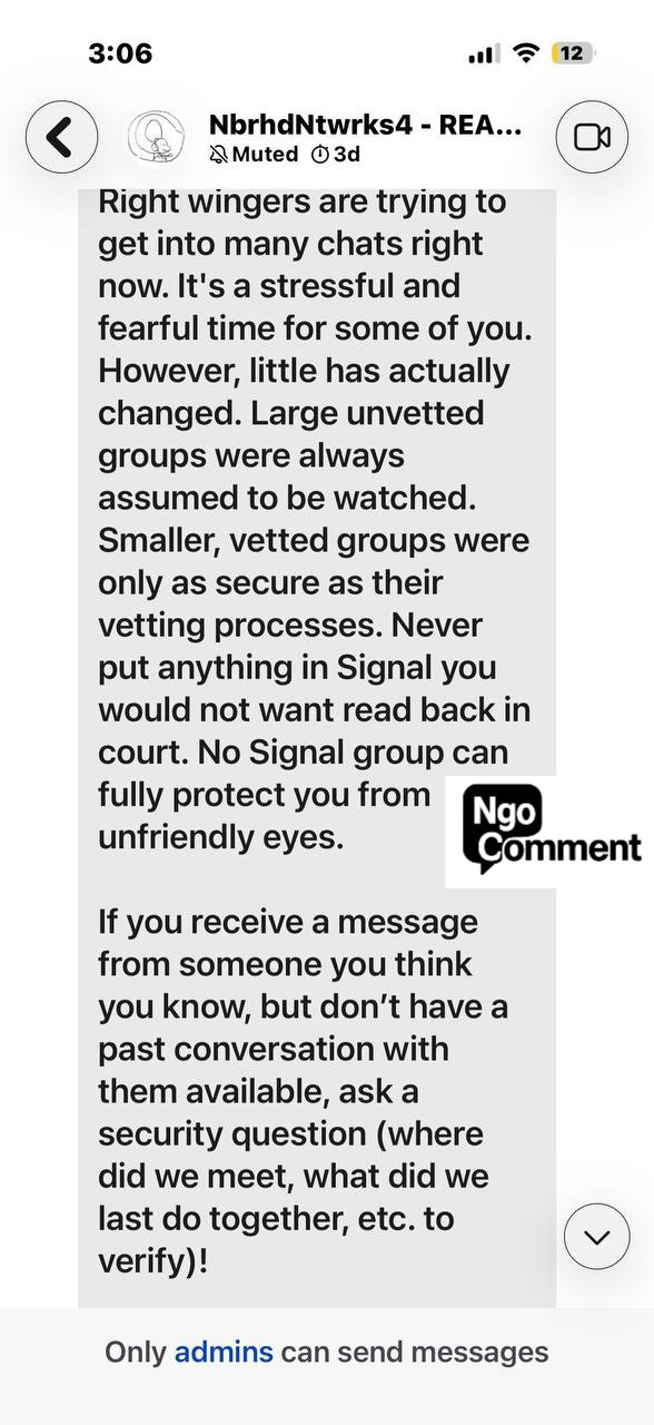 “Right wingers are trying to get into many chats right now,” warned an administrator using the moniker “Moss.” “Never put anything in Signal you would not want read back in court. No Signal group can fully protect you from unfriendly eyes.”