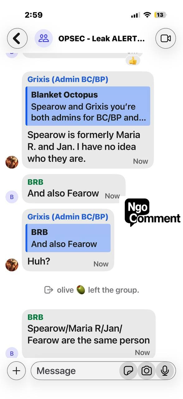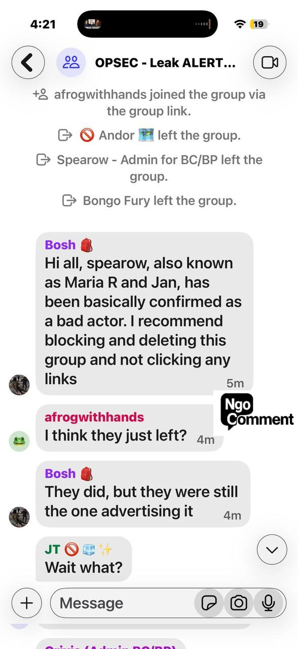 “Spearow, also known as Maria R and Jan, has been basically confirmed as a bad actor,” wrote a user named “Bosh.” “I recommend blocking and deleting this group and not clicking any links.”