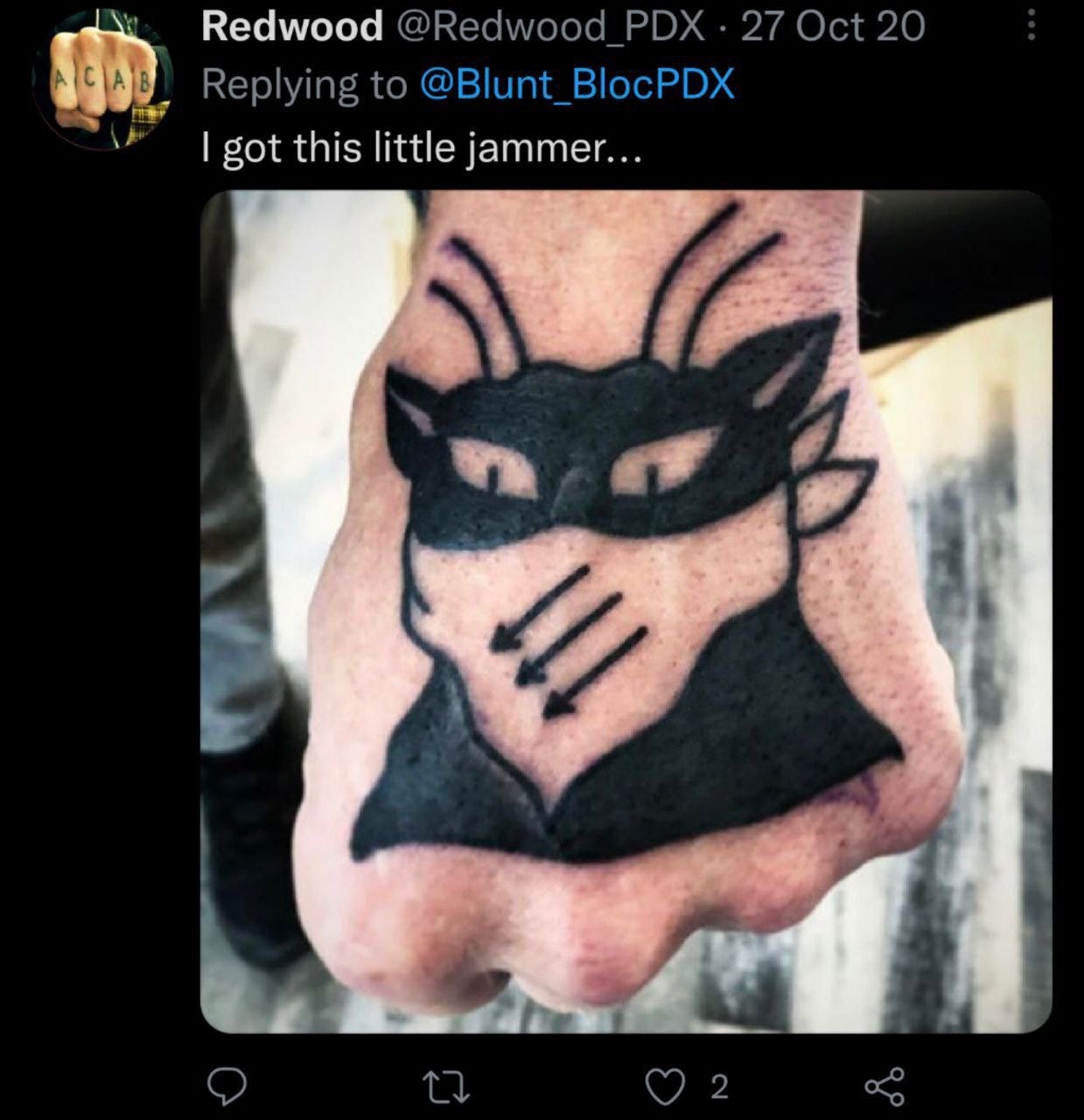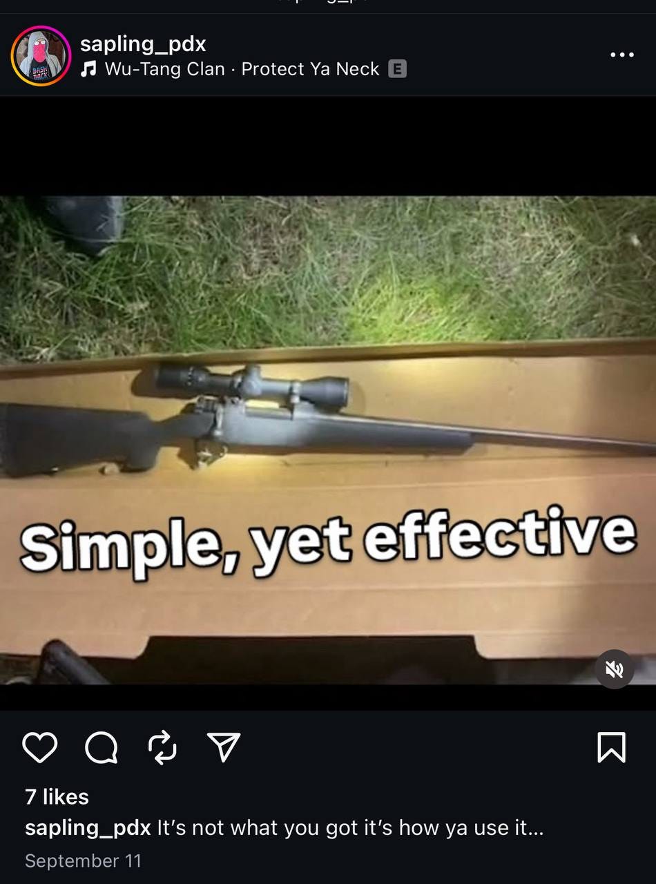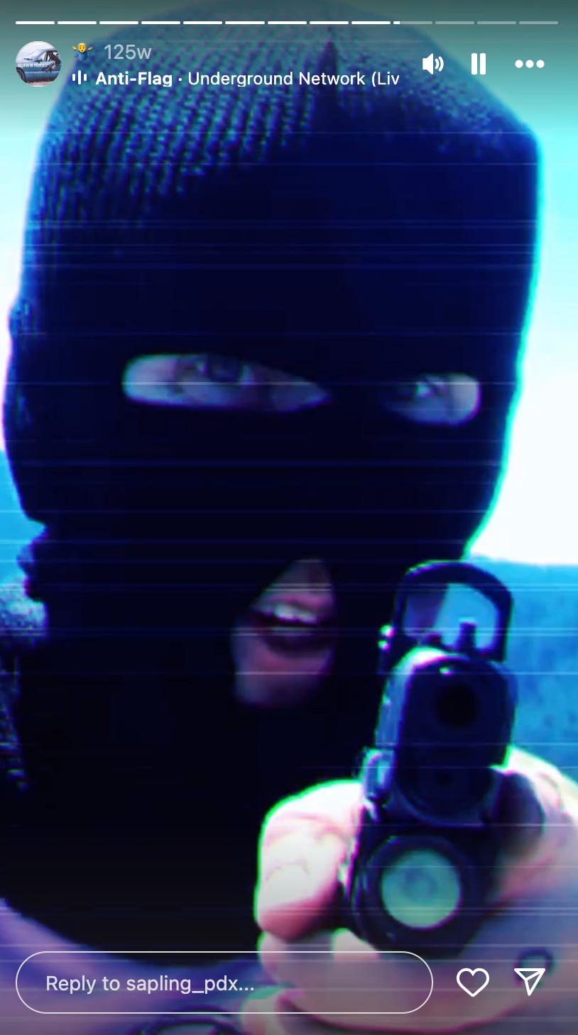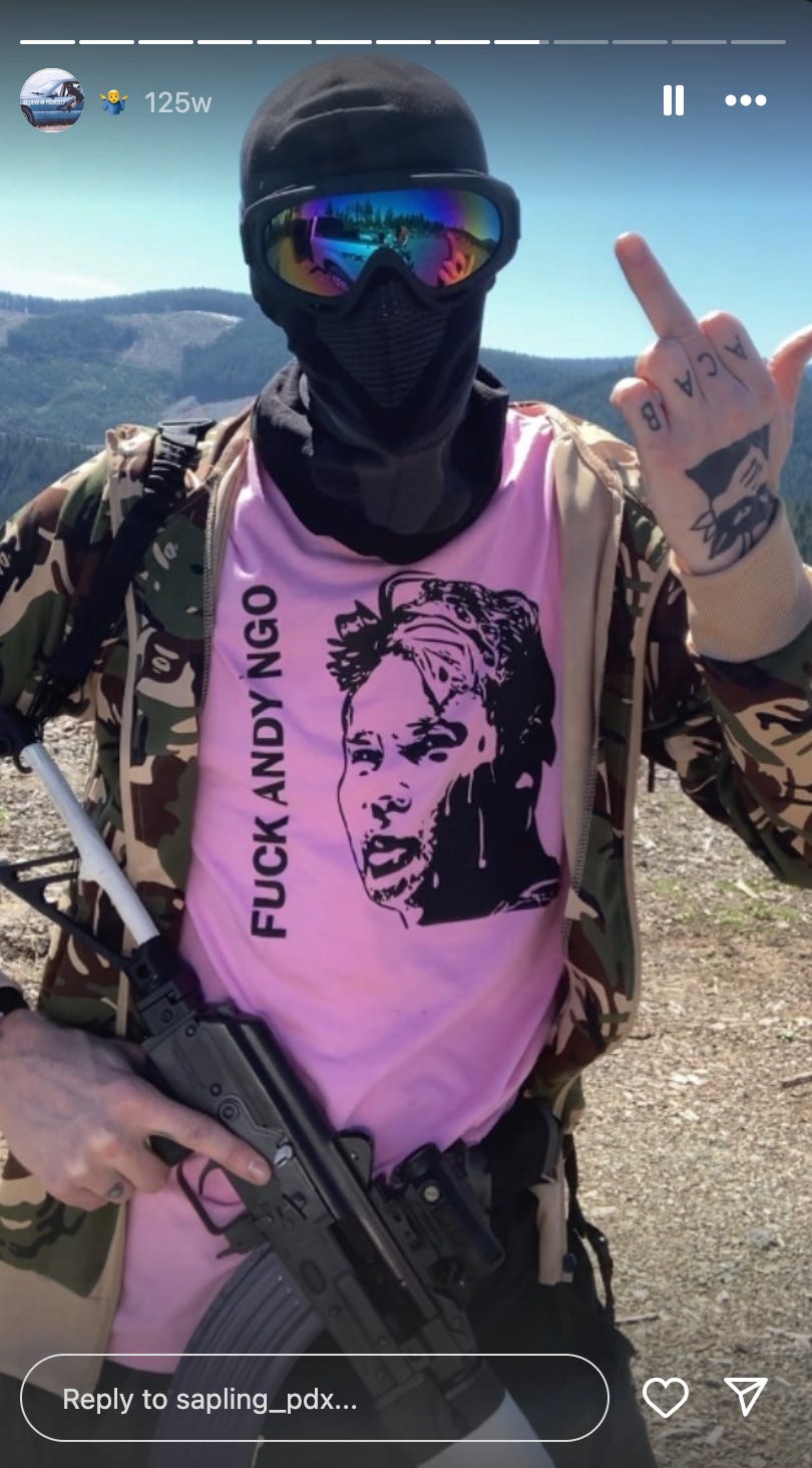 The “oldgrowth1312” account, which once operated another account called “redwood_pdx” on X, is tied to a man marked with an Antifa tattoo and “ACAB” across his knuckles. On Instagram, under “sapling_pdx,” he shared the same video along with images of his arsenal of firearms and ammunition.