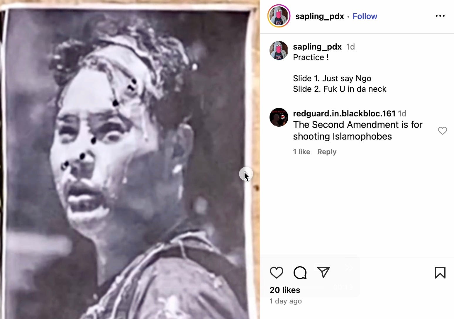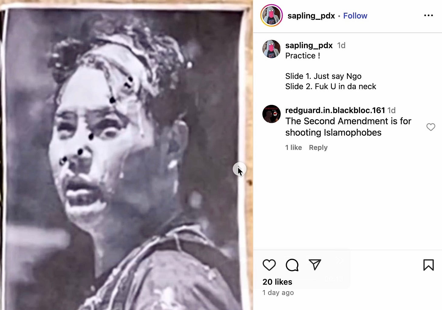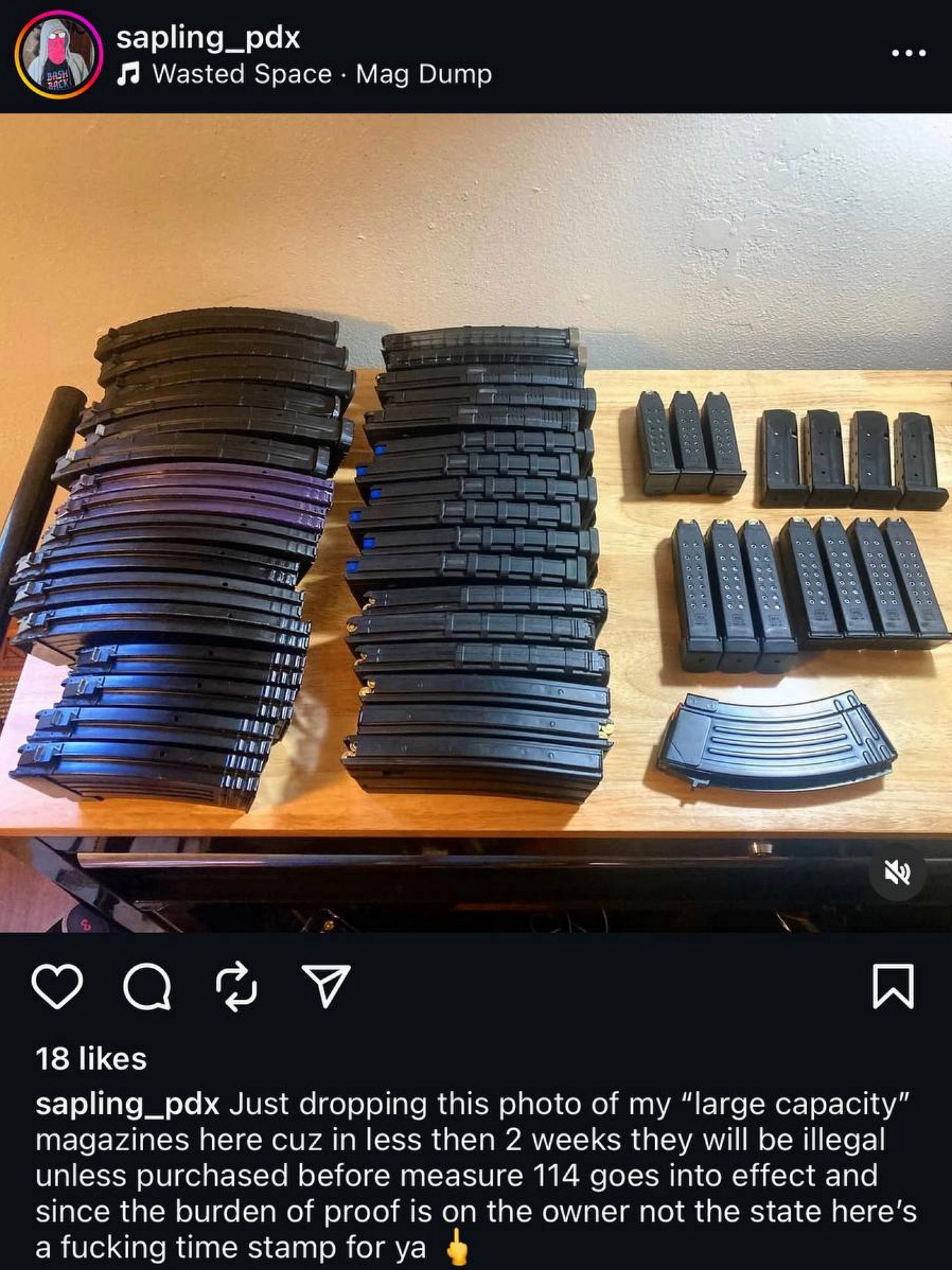The “oldgrowth1312” account, which once operated another account called “redwood_pdx” on X, is tied to a man marked with an Antifa tattoo and “ACAB” across his knuckles. On Instagram, under “sapling_pdx,” he shared the same video along with images of his arsenal of firearms and ammunition.