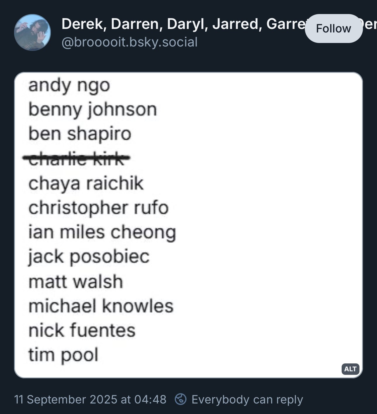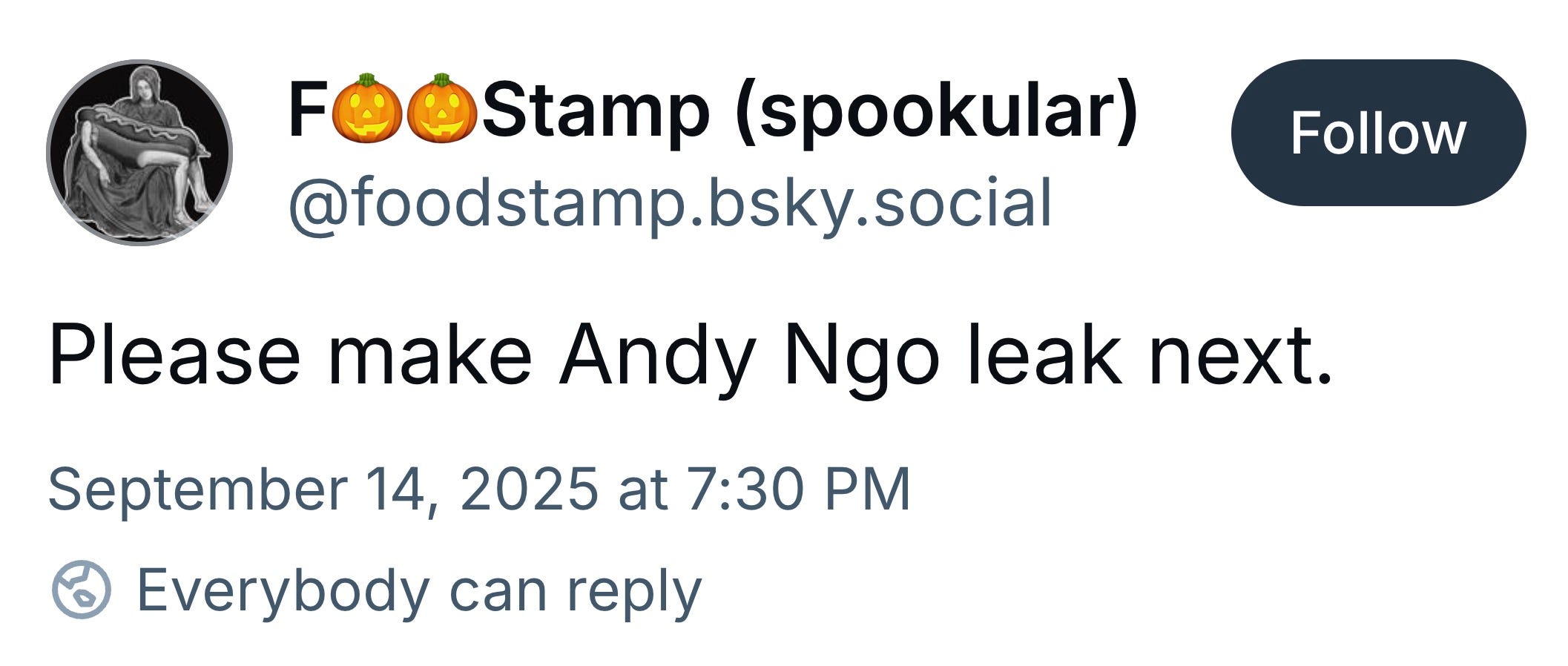 Some threats are explicit, others coded. “Please make Andy Ngo leak next,” wrote Portland Antifa member Albert N. Carter (b. 1987) on Bluesky, using the alias “Foodstamp.” Carter plays in the Antifa band DEADWITCH. Meanwhile, kill lists of conservative figures with Charlie Kirk’s name crossed out circulate online.