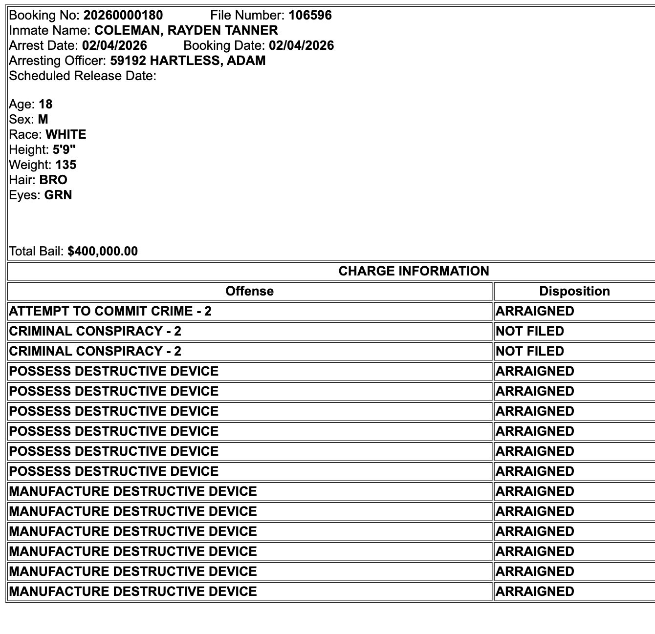 He is in custody in Columbia County, Ore. and has been charged with six counts of unlawful manufacture of a destructive device, six more of unlawful possession of a destructive device and one count of attempted second-degree assault. Additional counts of criminal conspiracy are likely to be filed.