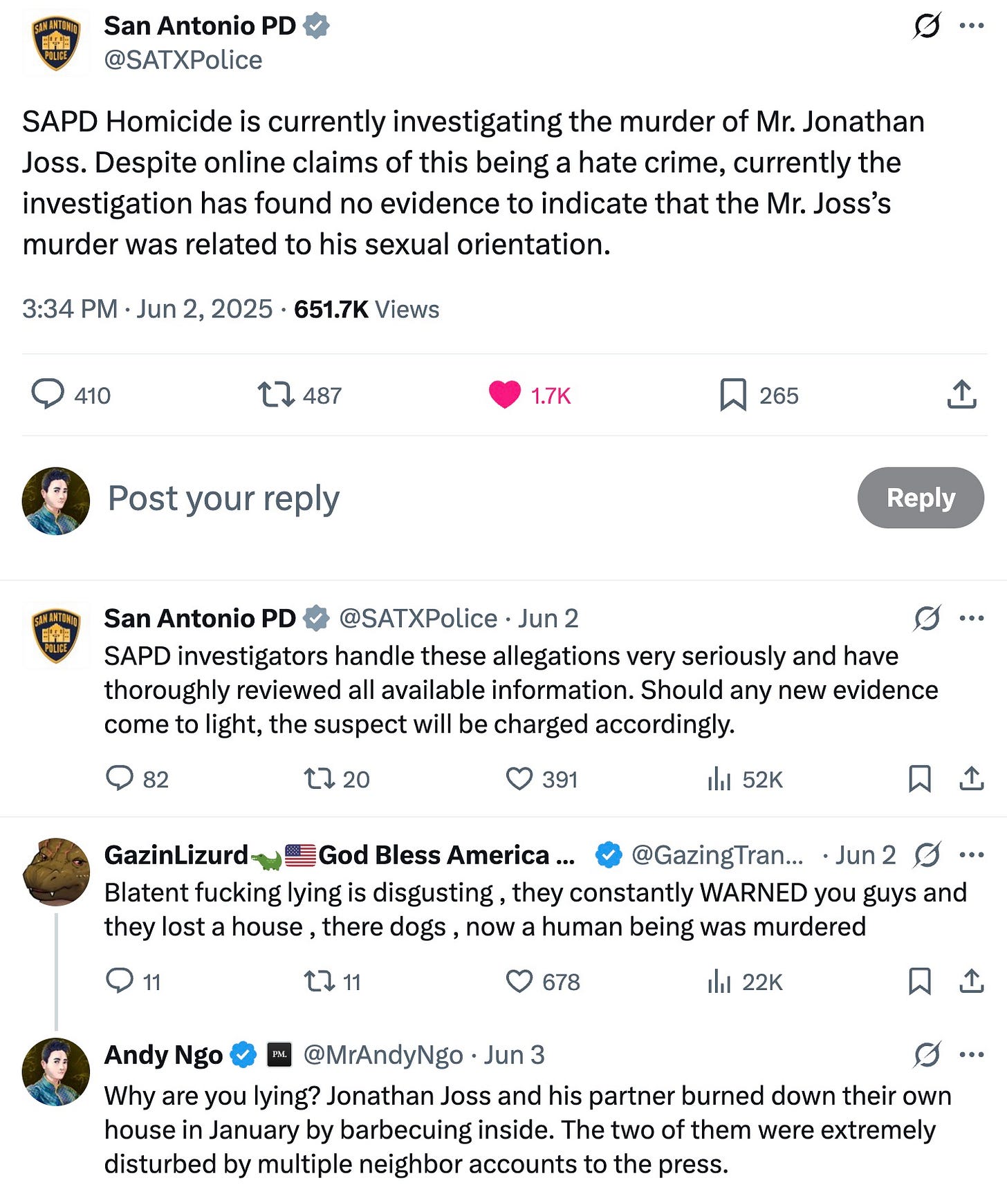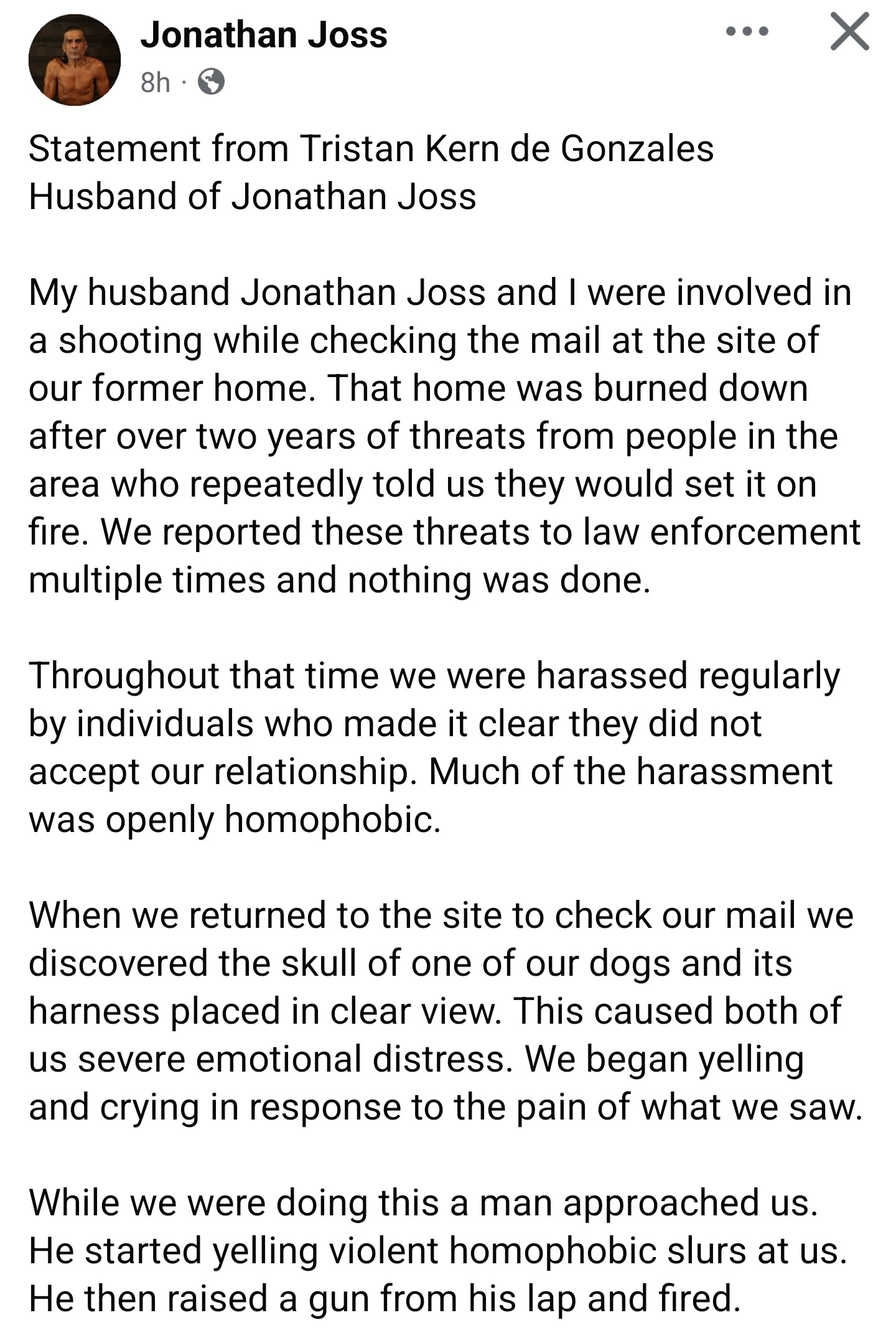 Joss' wife, Lindsey C. Kern, who now uses the name “Tristan Kern de Gonzales,” claimed the killing was a “homophobic” murder. Joss was in a heterosexual relationship with Gonzales, who is a woman who identifies as male. Nearly all media reporting has referred to Gonzales as Joss’ “husband,” therefore fooling the public into thinking they were a gay couple targeted in Texas.