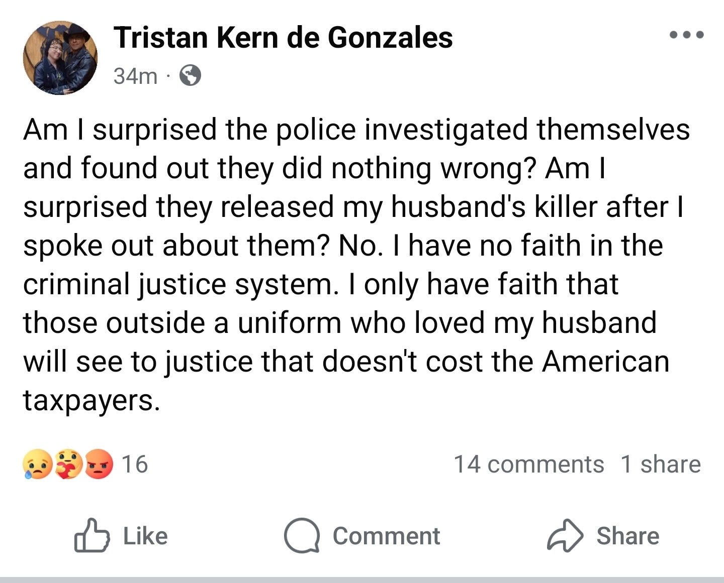 “I have no faith in the criminal justice system,” Gonzales wrote on Facebook. "I only have faith that those outside a uniform who loved my husband will see to justice that doesn’t cost the American taxpayers.”