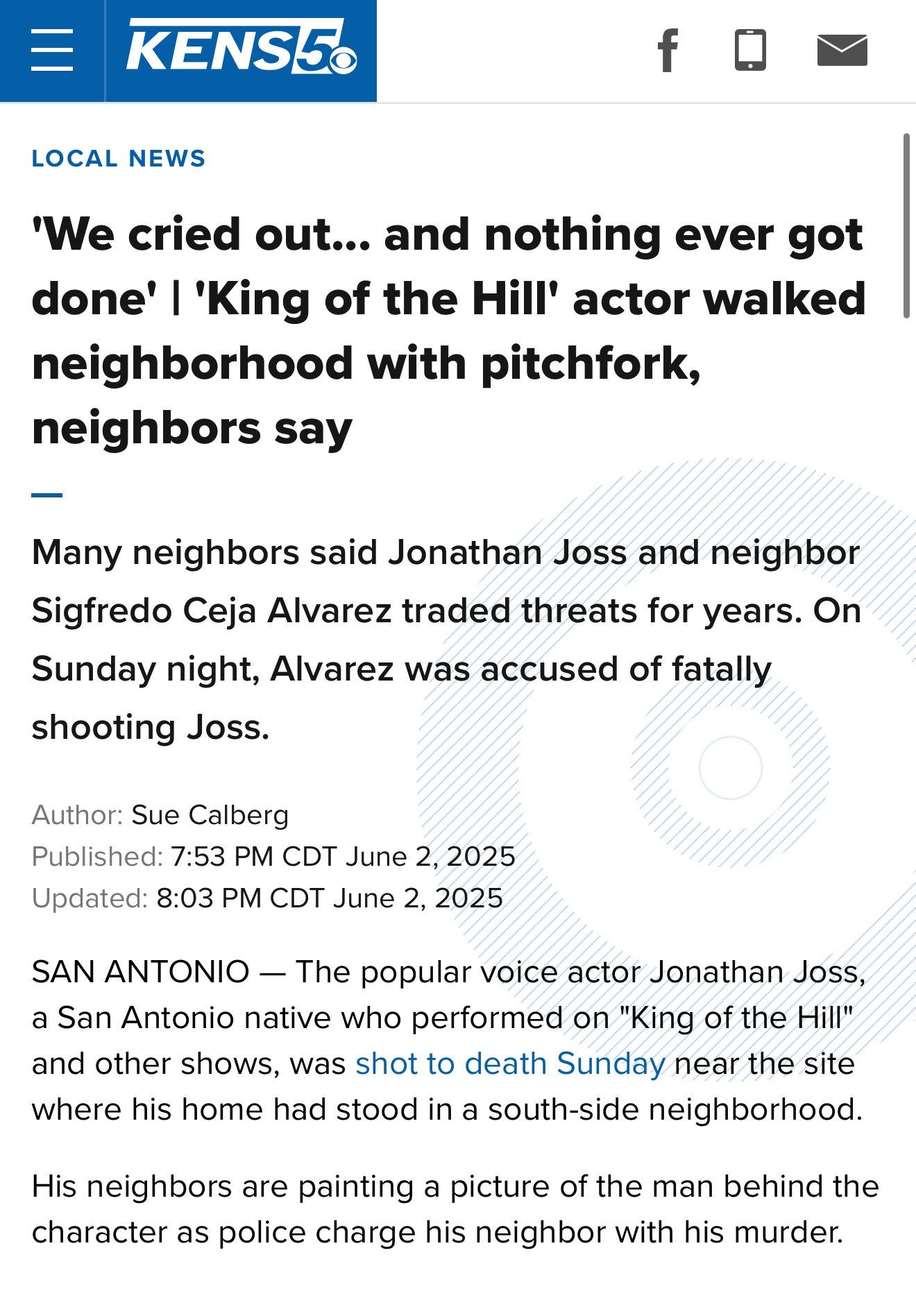 Neighbors told media he often ranted outside and got into disputes with people in the neighborhood. The day before his death, Joss discussed his struggles with substance abuse and mental health on the Bwaaa! A King of The Hill Podcast. The day before that, he crashed a King of the Hill panel at the ATX TV Festival in Austin. Not invited to speak, Joss hijacked a microphone and talked about his home being burned down, claiming it was “Because I’m gay.”