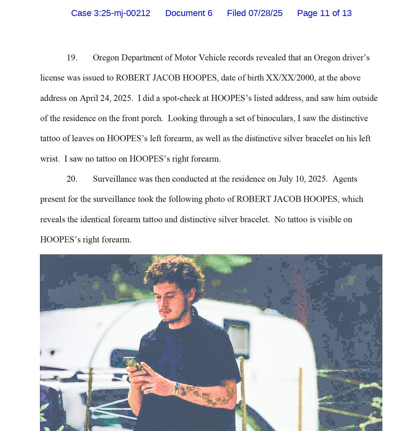 According to the criminal complaint, the FBI surveilled Hoopes at his home on the 6000 block of Northeast 16th Avenue in Portland, Ore. after identifying him from photographs and videos taken during the day of the attack.
