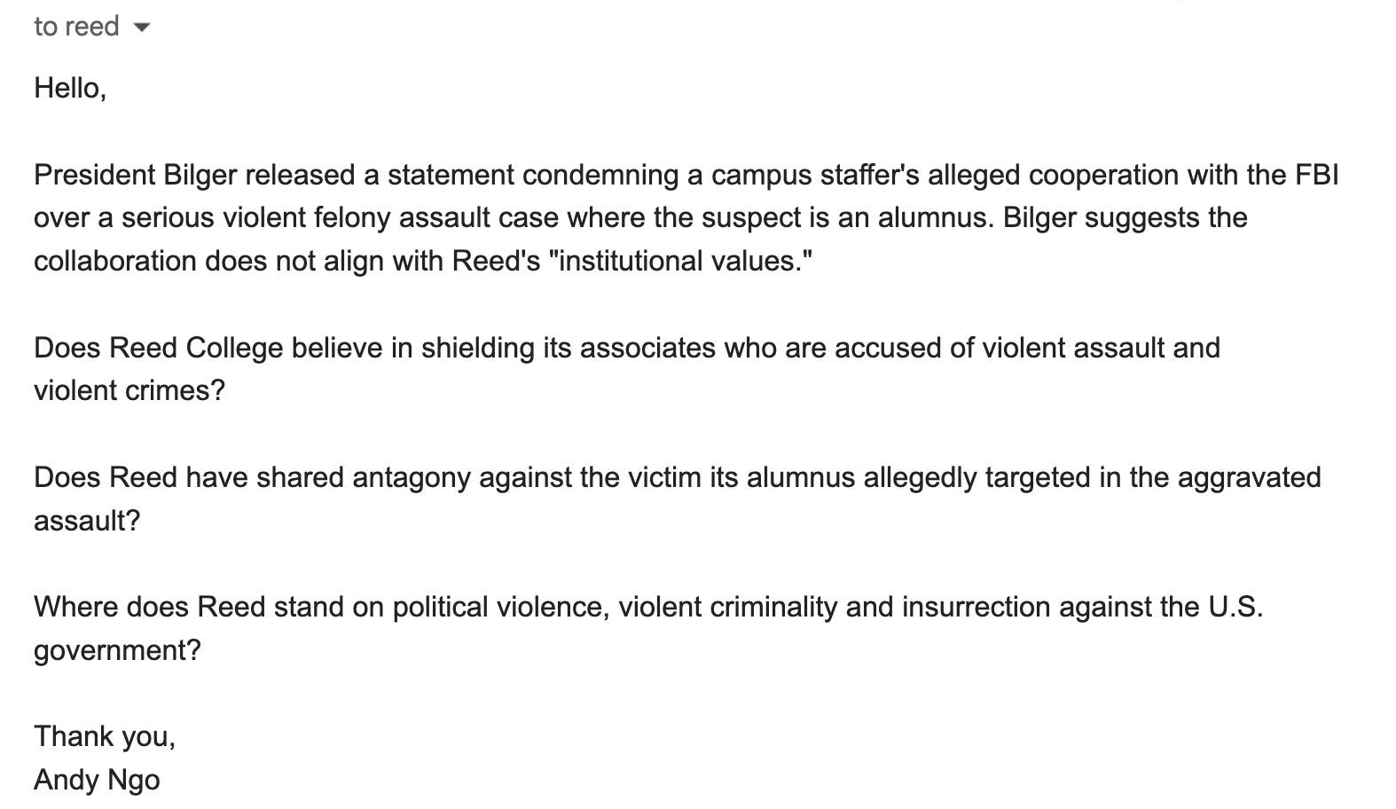 Reached for comment, a person from a PR company contracted with Reed College declined to answer questions and directed me to the same statement that was released. I have attached a screenshot of my inquiries that were left unanswered: