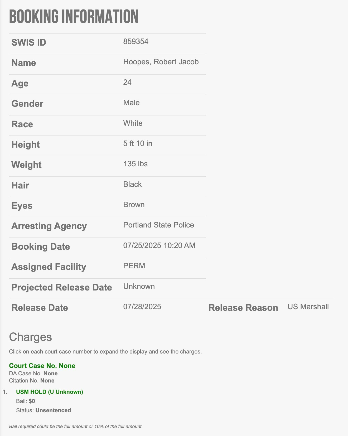Another Portland Antifa violent suspect has been federally charged, this time for one of the most violent attacks on federal law enforcement in Portland so far. Trans nonbinary far-left militant Robert Jacob Hoopes ("he/they") has been charged with felony aggravated assault of a federal officer with a dangerous weapon and felony depredation of federal property in excess of $1,000.