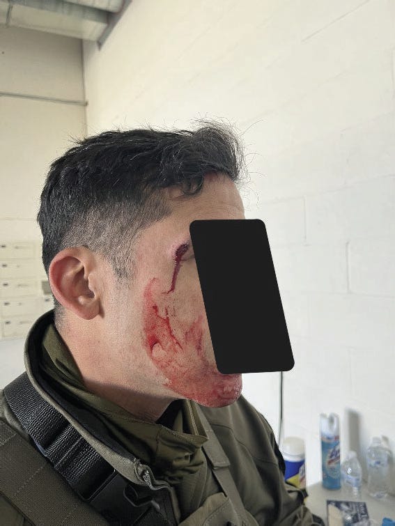 AV1 [“adult victim 1”] told me that at approximately 5:40 PM, he was attempting to remove an obstruction from the doorway of the ICE building. When AV1 opened the door, he observed S1 [“subject 1”] throw a rock around the open door, which struck AV1 in the head. AV1 realized he was injured when he saw blood on the inside of his gas mask and removed himself from the doorway. AV1 received medical attention from other officers on scene and had an approximately 2-inch gash on his right eyebrow. AV1 said the wound bled profusely, to the point of obstructing his vision. AV1 received first-aid treatment from teammates, including glue, adhesive sutures, and bandages to hold the wound closed. The first attempt to close the wound failed.
