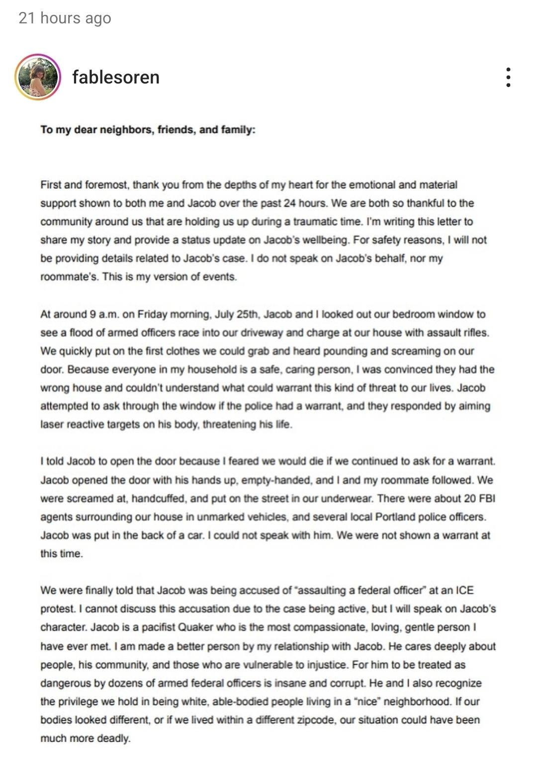 Fable Sorenson, Hoopes’ woke far-left girlfriend from California, also released a statement about how they tried different tactics to delay his arrest when officers showed up at the home and ordered everyone to come outside with their hands up. She said they narrowly survived the arrest only because they are in a nice white neighborhood.