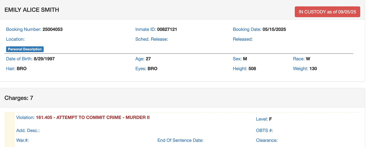 However, I dug further and saw that the “Emily Smith” in custody is actually booked as male. Could this be Ronald Watson? Was he in custody already and federal authorities just weren’t aware? The birthdate was off by one year from Watson as listed by the FBI, but it’s not unusual for suspects without identification to lie about their birthdate or other information.