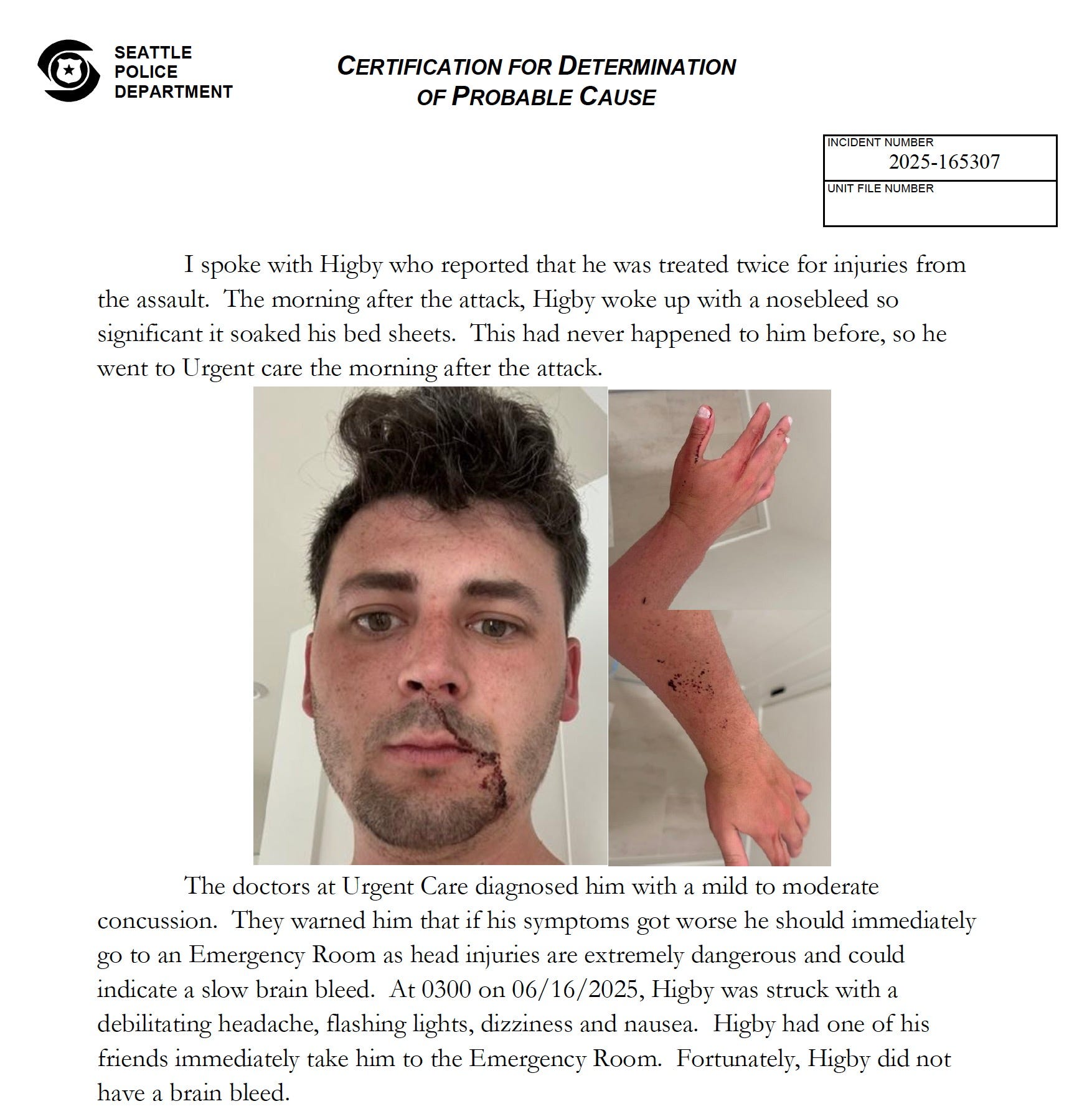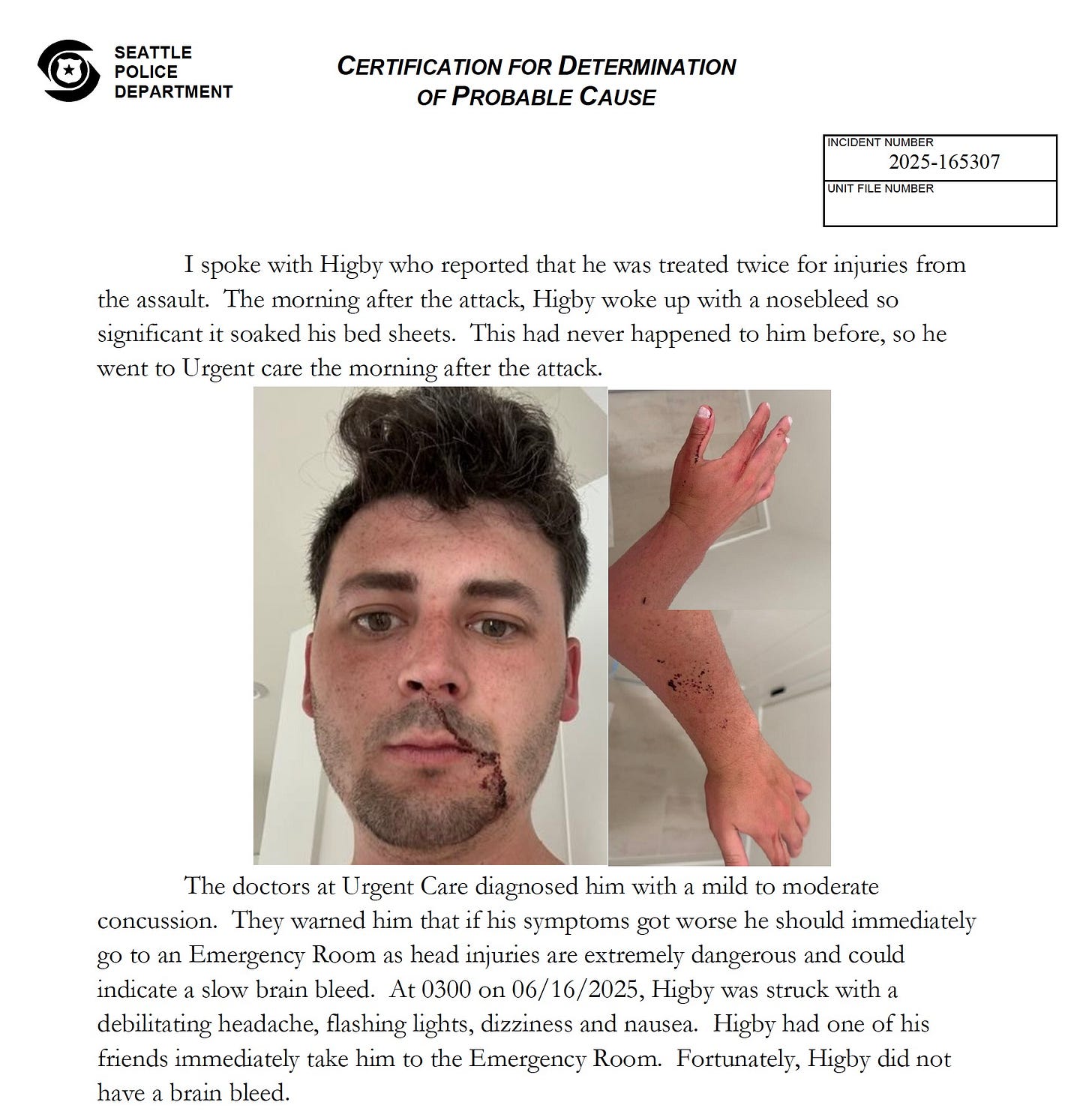 “Higby, was grabbed around the neck and then began taking punches to the head,” reads the probable cause statement from police. “In the middle of the assault, a nearby person began recording. In the recording a tall skinny W/M with blond dreadlocks can be seen vigorously striking Higby in the head multiple times.”