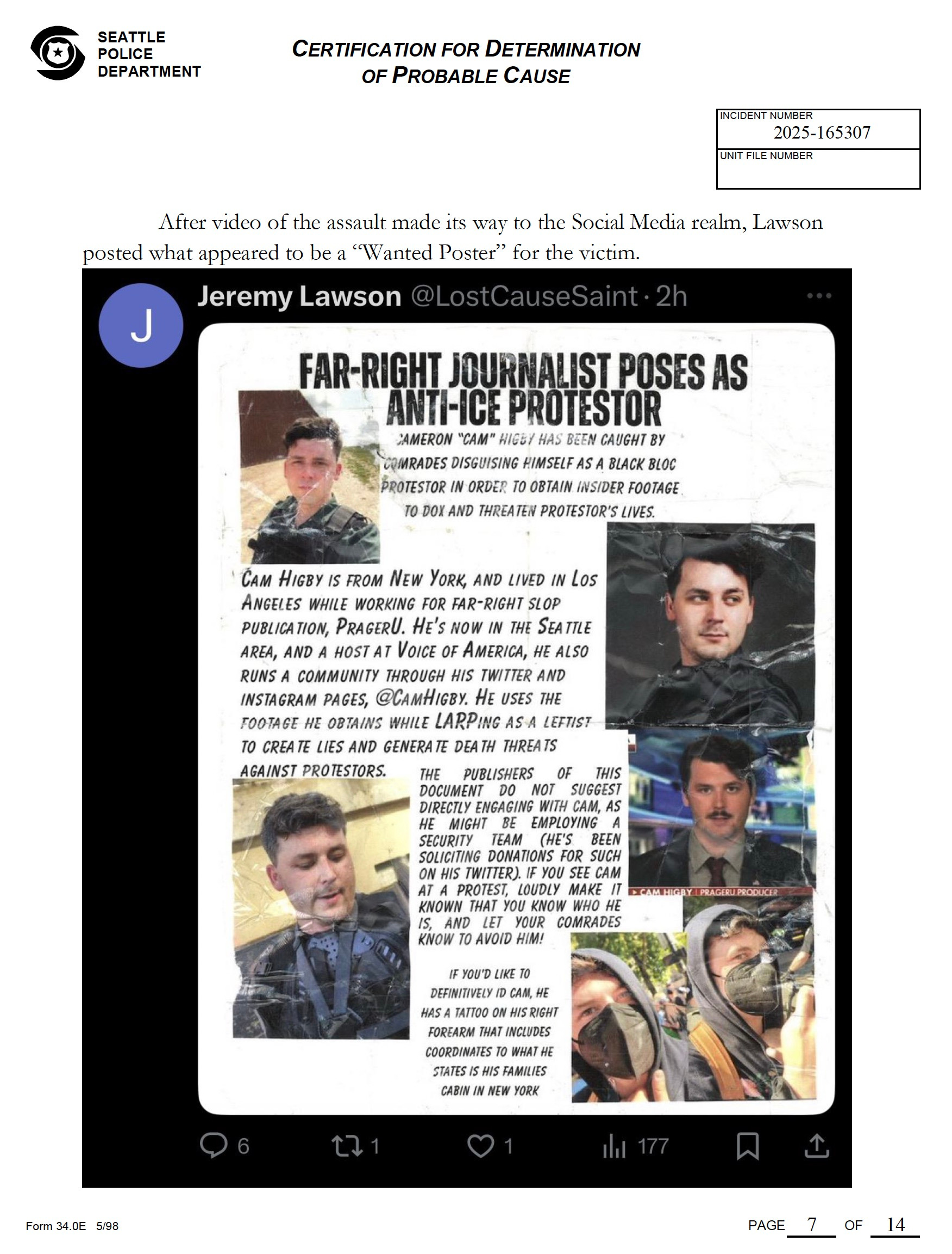Higby was covering an Antifa anti-ICE direct action attack on a federal building in downtown Seattle when he was identified and beaten on the head. Higby and journalist Katie Daviscourt later identified the suspect, who was caught on camera partially unmasked, as 33-year-old Jeremy Calvin Lawson. He uses the alias “Jack.” But no arrest came for weeks.