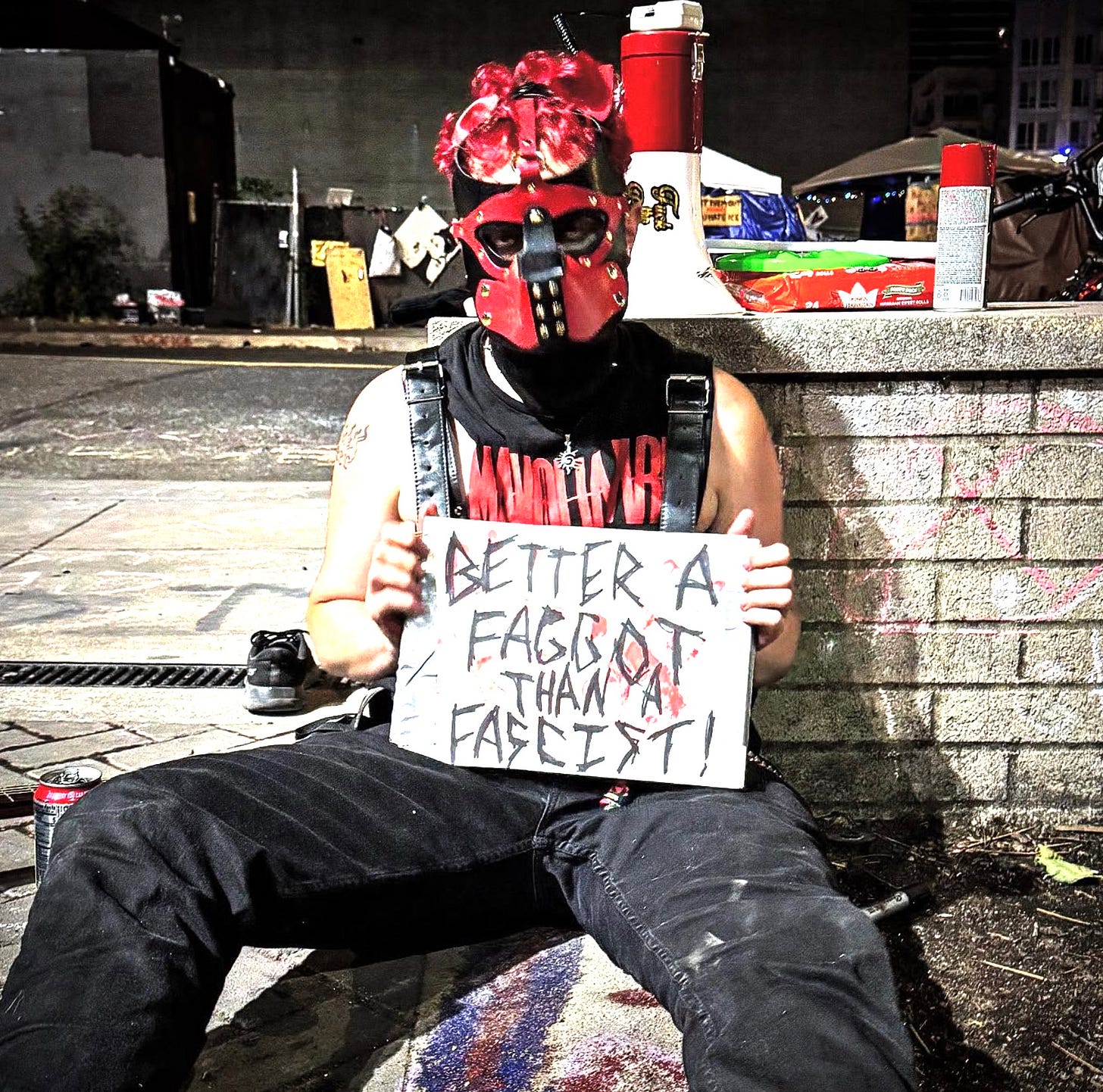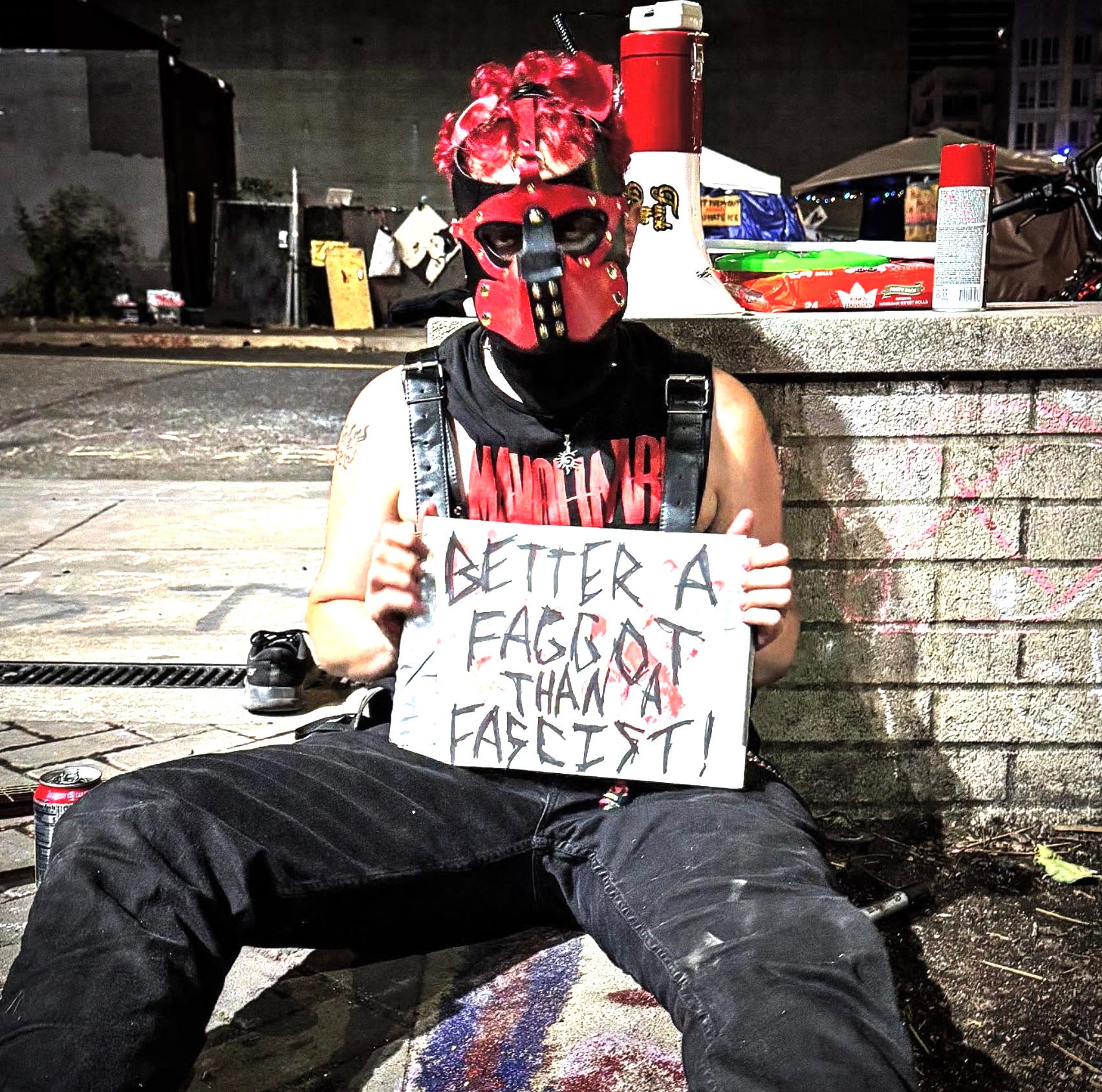 Among the regulars at the direct action and encampment is 21-year-old Ashlyn Burgess, who now goes by “Finneas” — though in the riot scene, she’s better known by her chosen alias: “Omen.” Subtle.