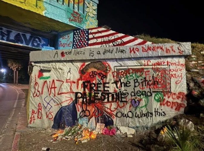I also spoke about what happened to a memorial mural to Charlie Kirk overnight in Pensacola, Fla. As soon as Antifa activists saw that a mural was being painted, they took photos and put out a call online for their comrades to attack. Leftists did exactly that and wrote, “A good Nazi is a dead Nazi” on the wall. They sprayed Antifa propaganda symbols. Chillingly, they also wrote one of the messages that the assassin engraved on one of the rifle cartridges used in the murder.