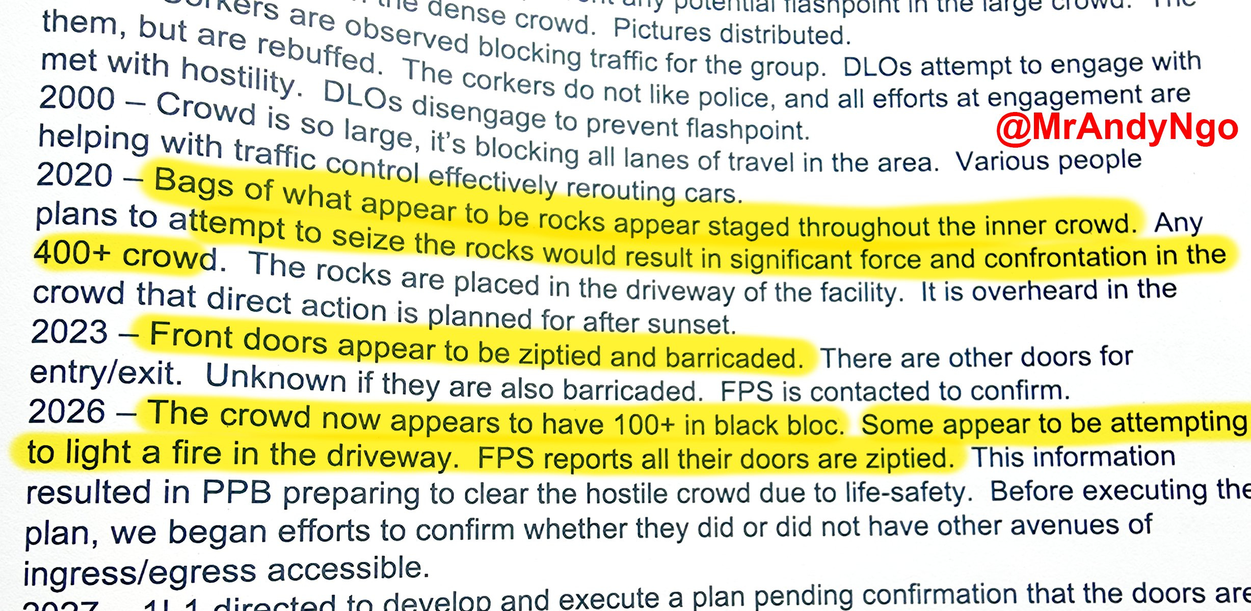 Fast forward to late September 2025. At a press conference responding to the President’s decision to surge federal resources to Portland, Day downplayed the nightly Antifa violence outside the ICE facility, claiming it was confined to “one city block” and that PPB didn’t need federal help. This was a bold lie.