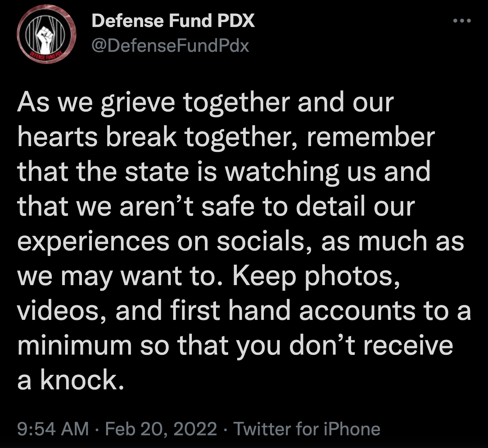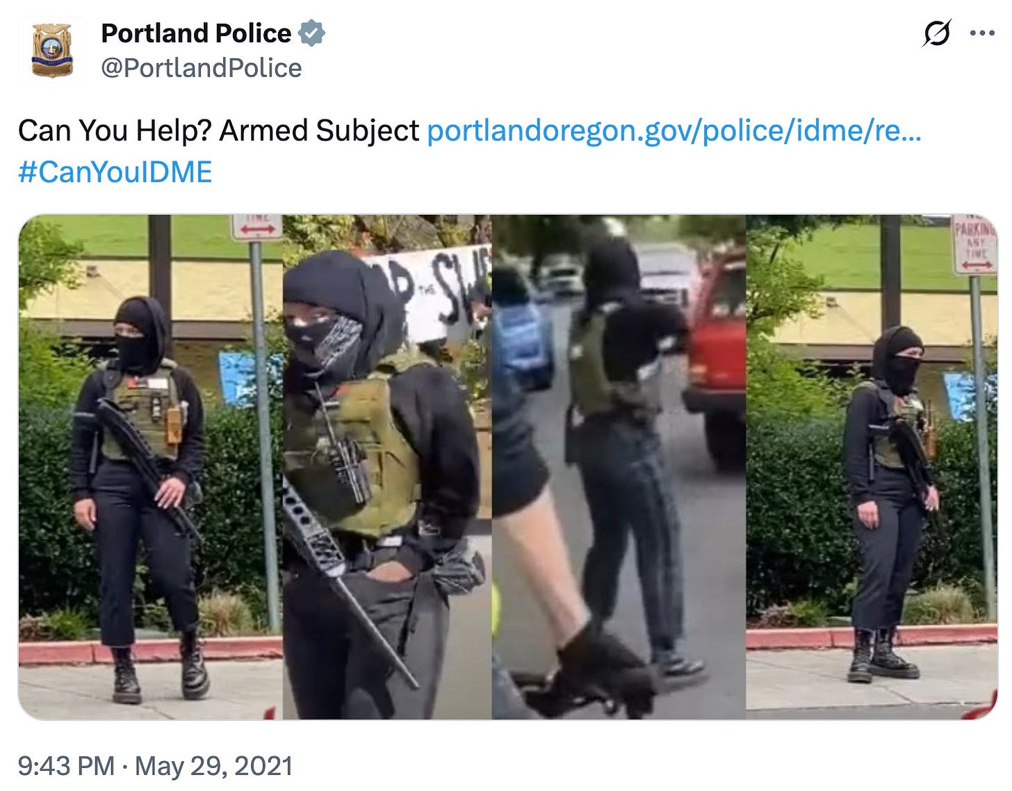 On Feb. 19, 2022, a large group of armed Antifa militants occupied streets around the park for a direct action supporting Patrick Kimmons, a black gunman killed by PPB officers in 2018 after shooting two people. Kimmons’ mother organized regular armed occupations under the banner of “Justice for Patrick Kimmons.” In May 2021, a driver was beaten and robbed of his firearm by the group in broad daylight. They also smashed up his vehicle. The PPB never arrested anyone, even after I identified suspects from their own BOLOs.