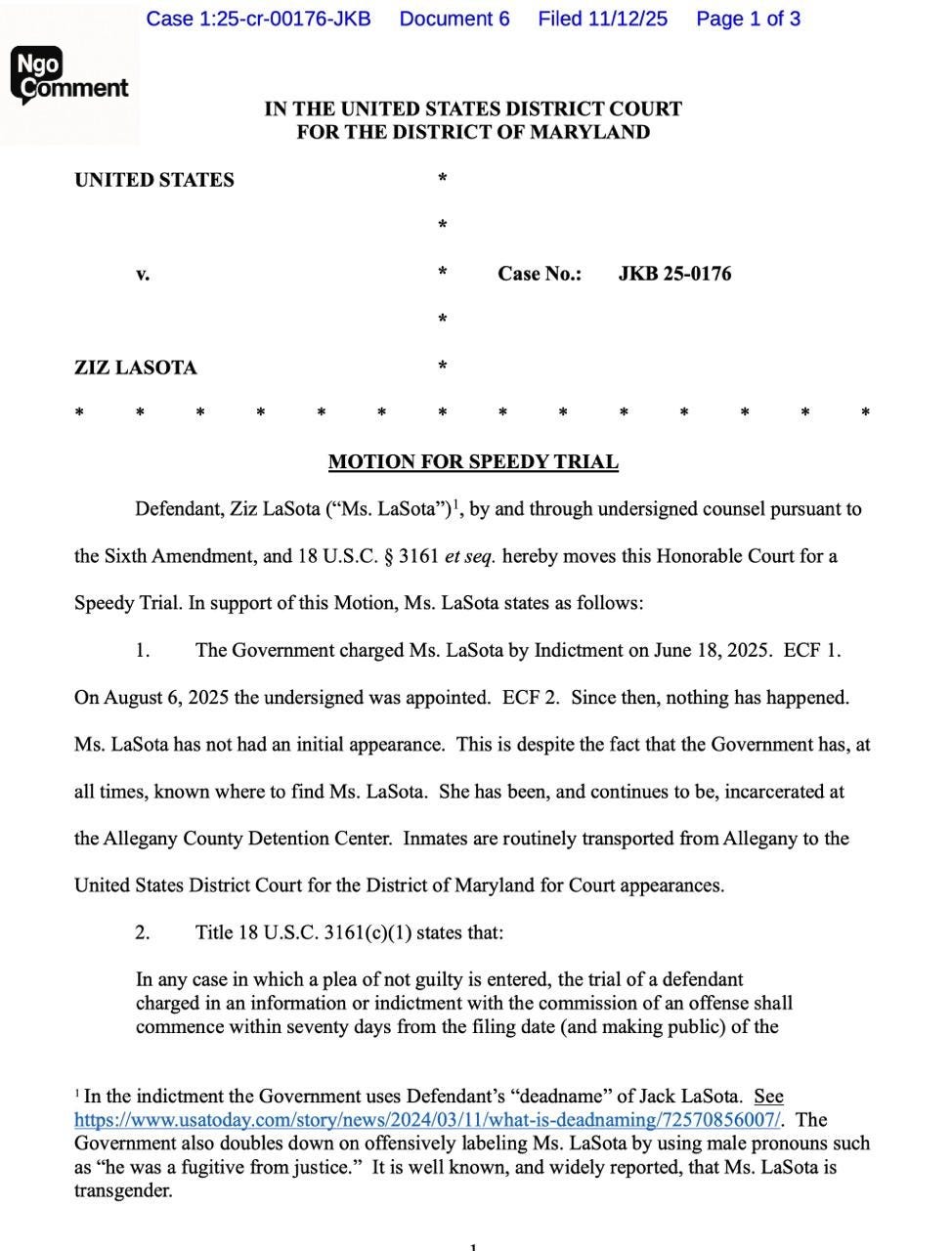 LaSota’s defense attorney, Gary Proctor, had recently filed a motion for a speedy trial and castigated the federal government for “deadnaming” LaSota and using male pronouns in documents and a press release.