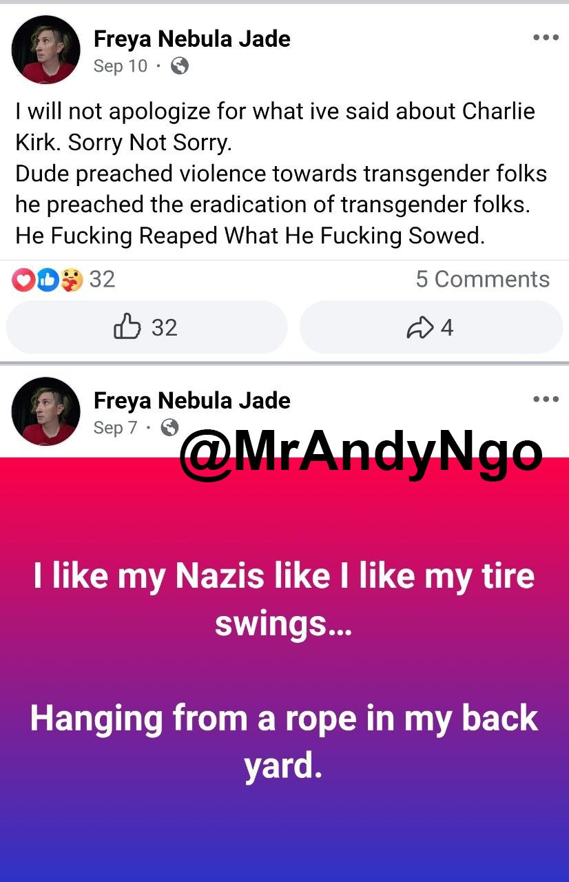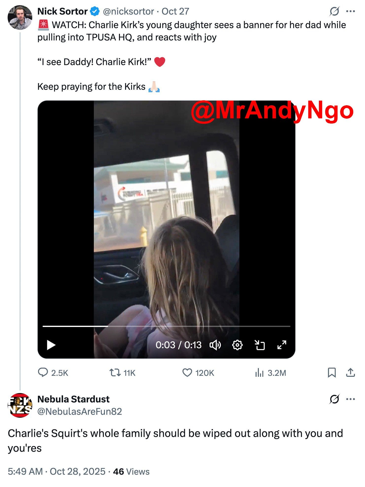 And in response to a video of the late Charlie Kirk’s toddler daughter, he posted on X: “Charlie Squirt’s whole family should be wiped out along with you and you’res [sic].”