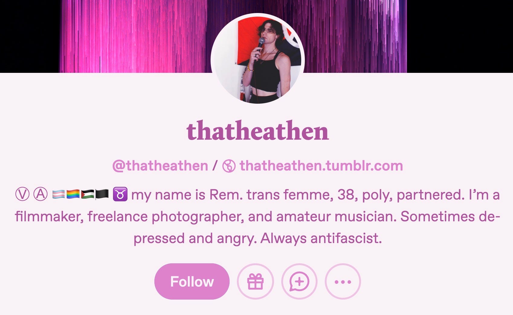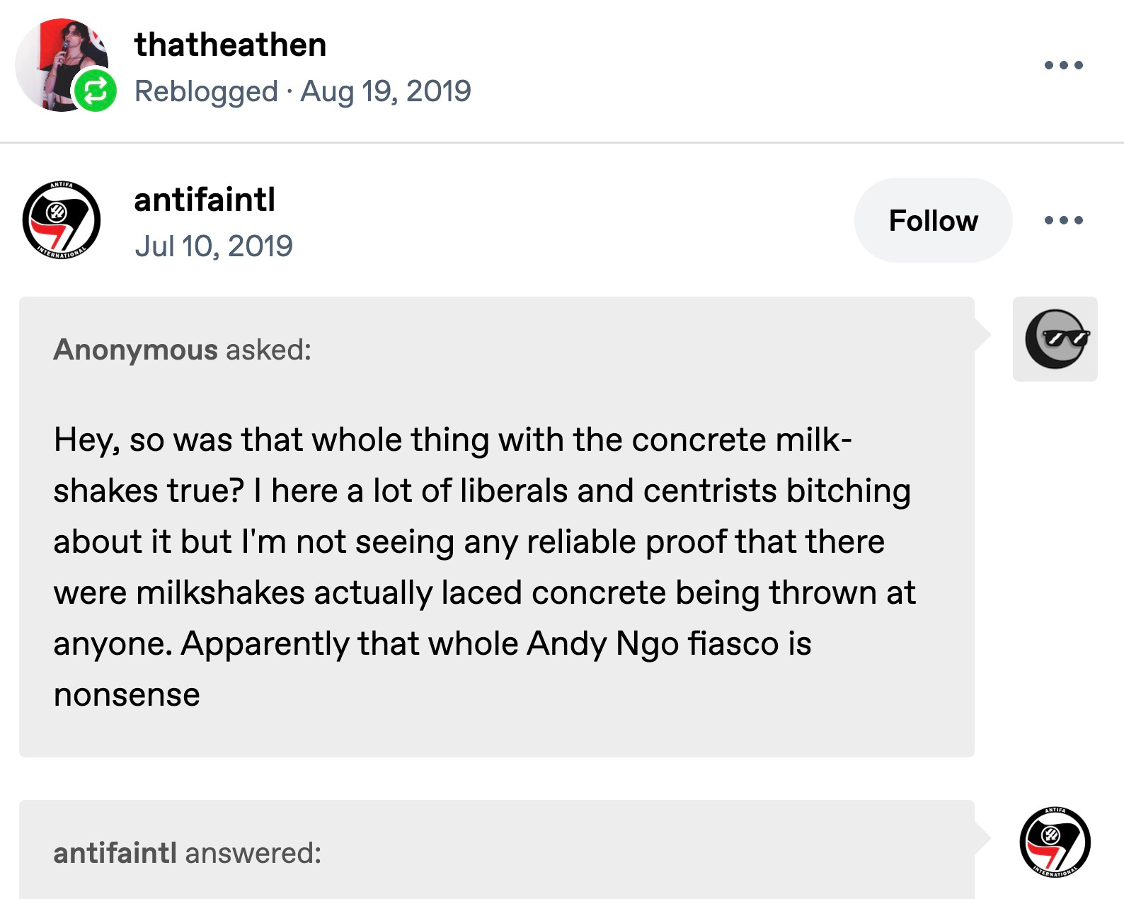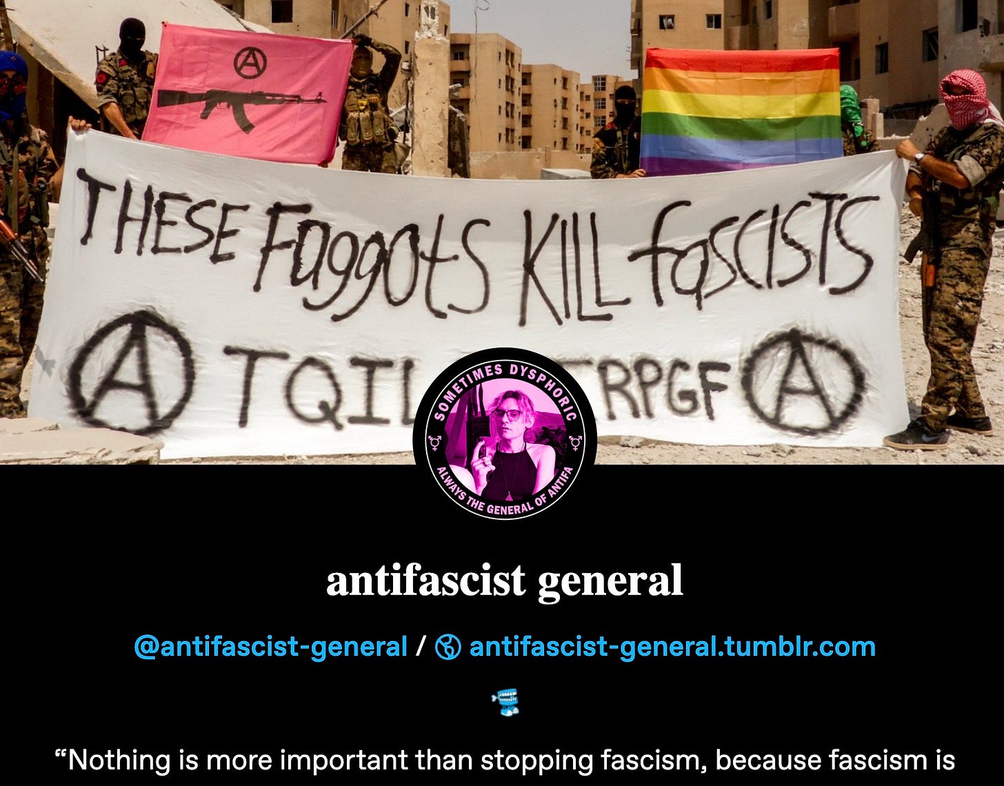 On one of his Tumblr accounts, “thatheathen,” in which Fadich identifies as a “trans femme” and “Always antifascist,” a dogwhistle slogan used by militant Antifa members, he shared propaganda content from the terrorist group Antifa International and celebrated violence against me. There are hundreds of Antifa propaganda posts on that account.