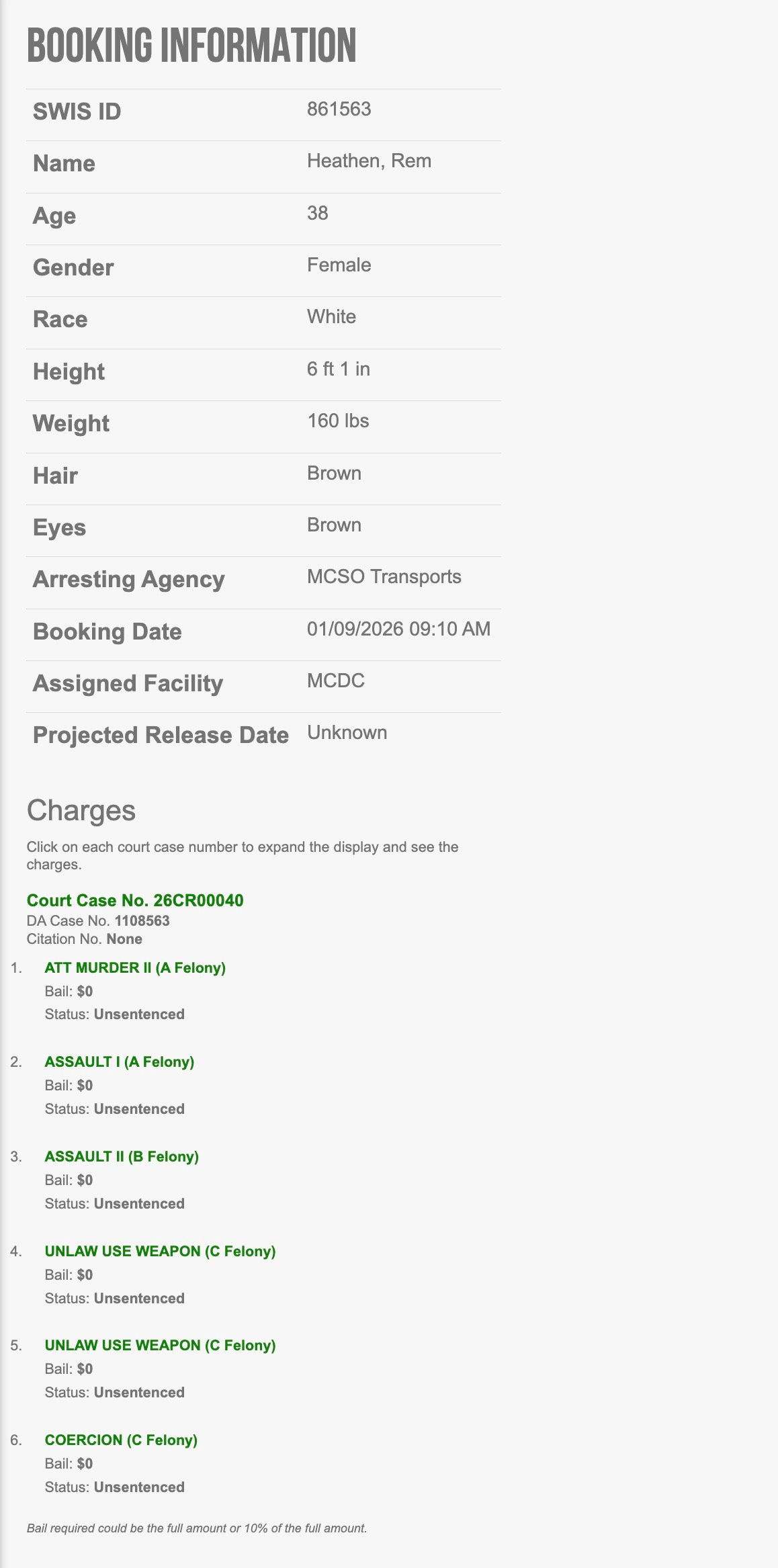 Rem Heathen, real name Michael Richard Fadich (born May 20, 1987), and Jennifer “Feya” Michelle Bitgood, real name Shawn Michael Bitgood (born May 1982), were allegedly involved in an attempted murder on Dec. 21, 2025 in the Mt. Tabor neighborhood of southeast Portland. A man was found with gunshot wounds in a parking lot of an apartment complex. He was taken to the hospital with serious injuries.