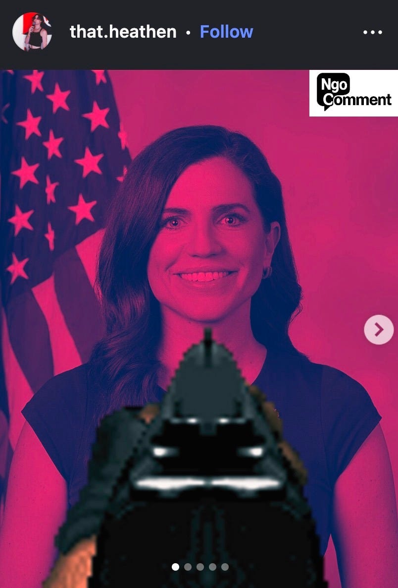 On one of Fadich’s Instagram accounts, he posted a death threat against South Carolina congresswoman Nancy Mace in May 2025. Her official portrait has a first-person graphic of a gun pointed at her face.