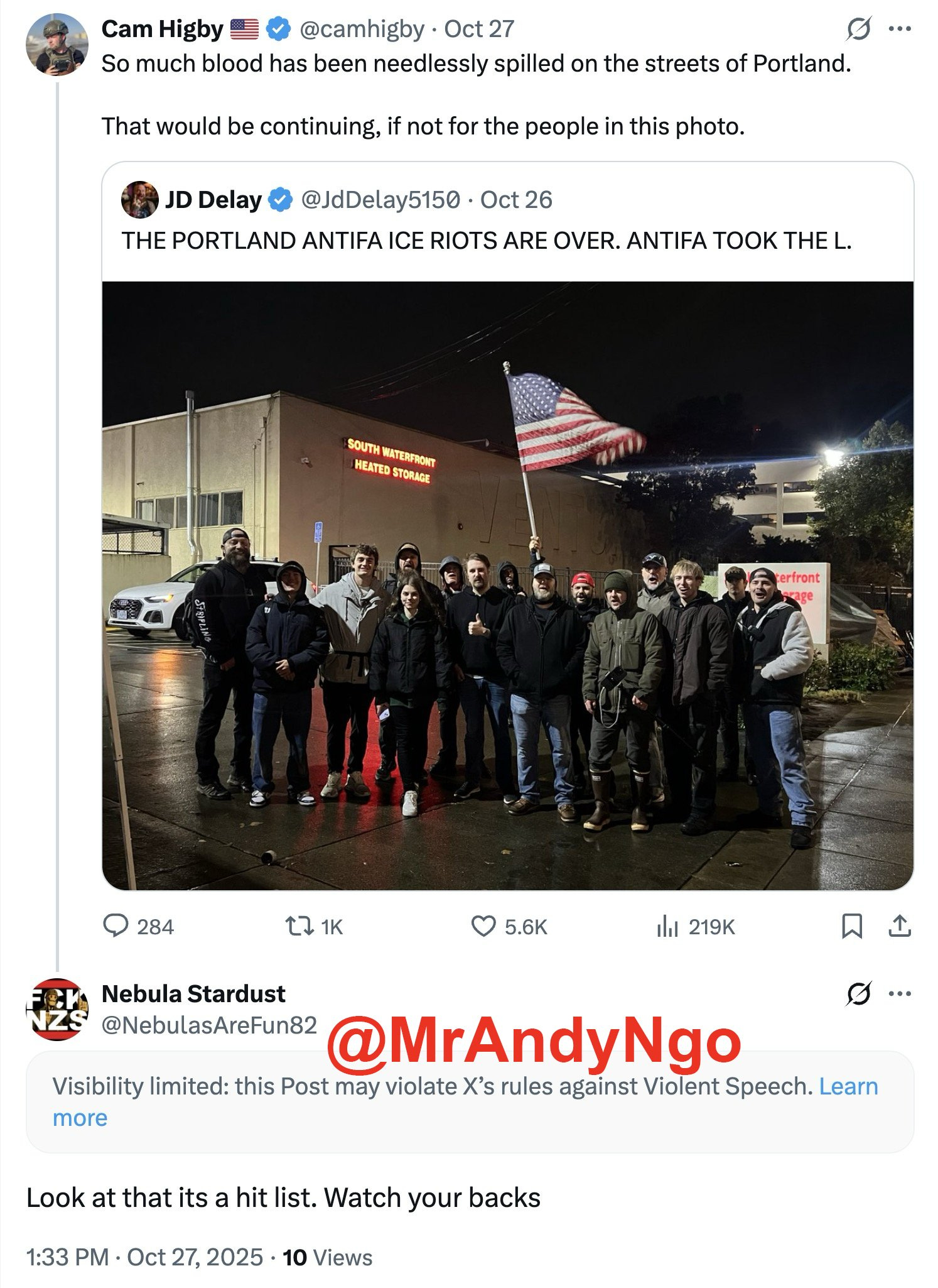 In October 2025, posting under the moniker “NebulasAreFun82” on X, Bitgood responded to conservative journalist Cam Higby posting a photo of conservative livestreamers, including Nick Shirley, outside the ICE facility. Bitgood wrote: “Look at that its a hit list. Watch your backs.”