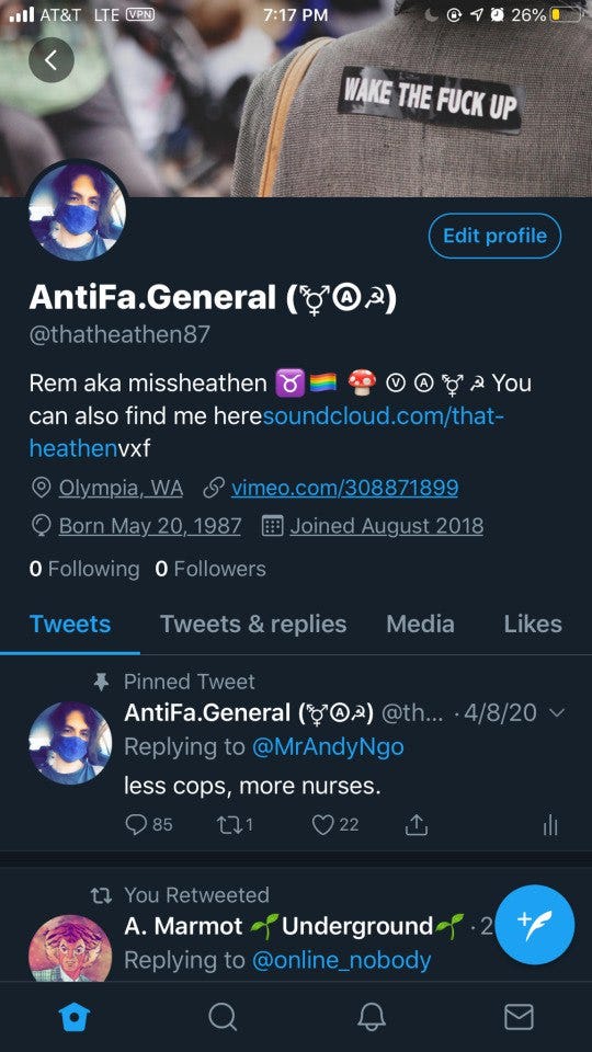 Another member of Fadich’s cell is a Portland Antifa member who uses the alias “Trigger Fae.” The man, who is trans, branded himself with Antifa logos, similar to how neo-Nazis tattoo themselves with fascist signs. “Trigger Fae” is in a romantic relationship with Fadich. He has not been charged with a crime.