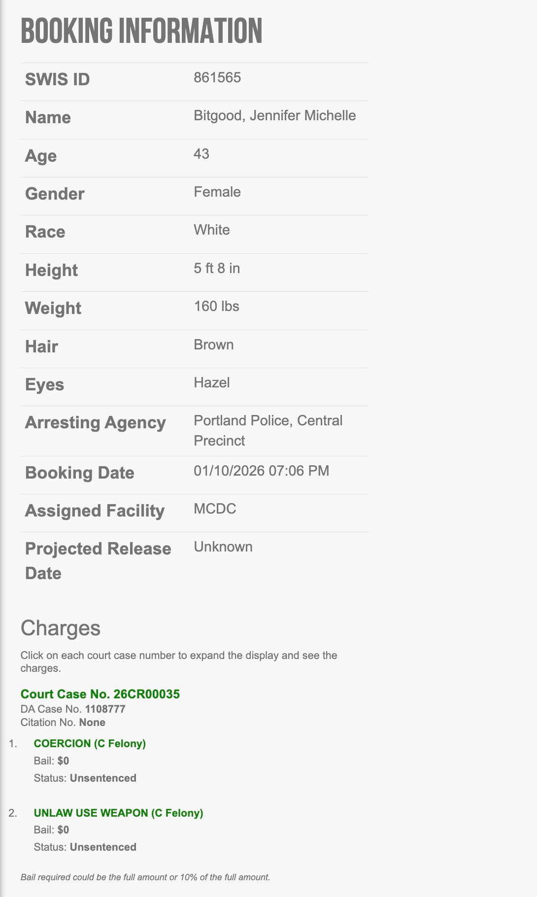 Late on Jan. 10, Bitgood was arrested at a far-left riot outside the Portland ICE facility on the warrant. He was in a group of masked militants dressed in black. Bitgood was charged with felony unlawful use of a weapon and felony coercion.