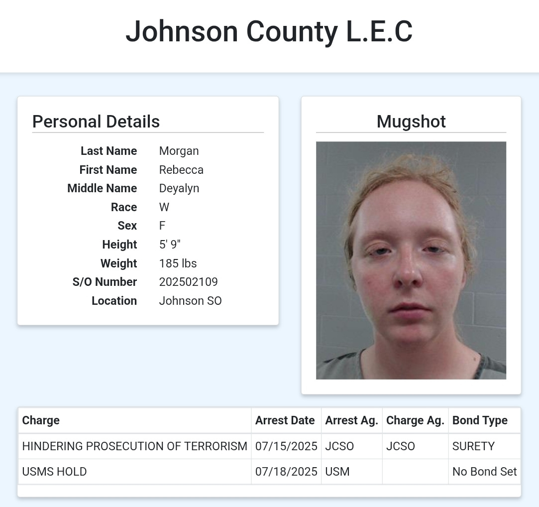 Rebecca Deyalyn Morgan, 38, is accused of helping hide alleged cell ringleader Benjamin Hanil Song while he was a fugitive for 11 days. Song, who was on the FBI and Texas Top 10 Most Wanted lists, was captured in Dallas on July 15. Morgan was arrested the same day and is being held on $2.5 million bond on a local charge of hindering the prosecution of terrorism. She also has a federal hold on her, suggesting she is a suspect in a sealed federal criminal case.
