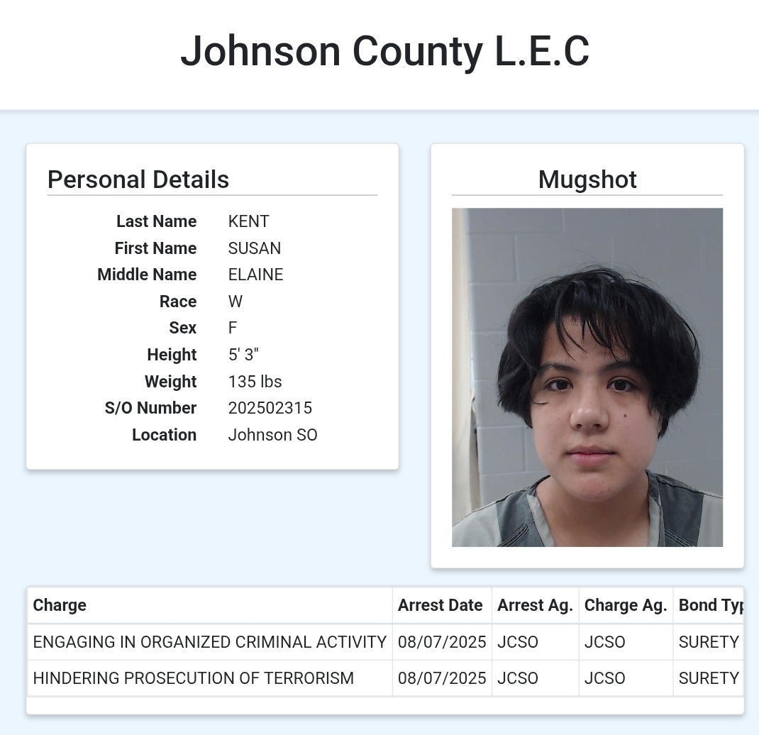 Susan Elaine Kent, 23, of Cedar Hills, was arrested on Aug. 7 on suspicion of engaging in organized criminal activity and hindering the prosecution of terrorism, both Texas state charges. In social media posts shared by far-left accounts, they refer to Kent with “they/them” pronouns and say she was helping lead the “DFW Support Committee,” the group raising funds for the terror suspects.